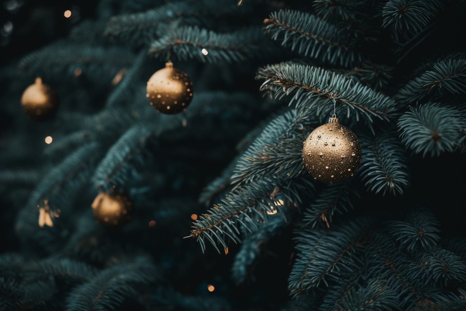 Close-up of a Christmas tree with golden baubles and lush green branches, creating a festive and cozy holiday atmosphere.