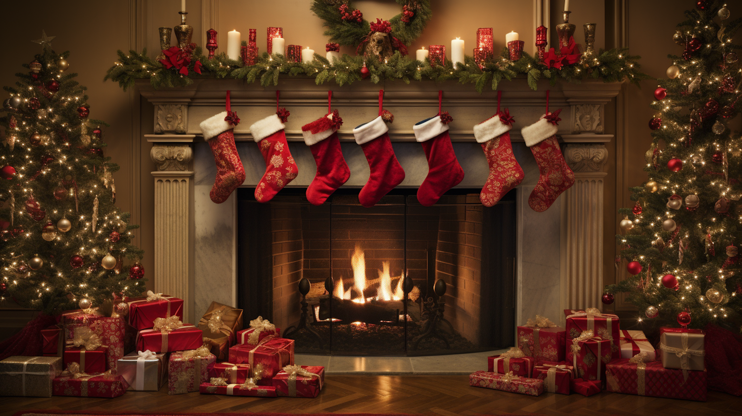 Festive Christmas fireplace with stockings, garlands, sparkling trees, and gifts, creating a warm holiday atmosphere.