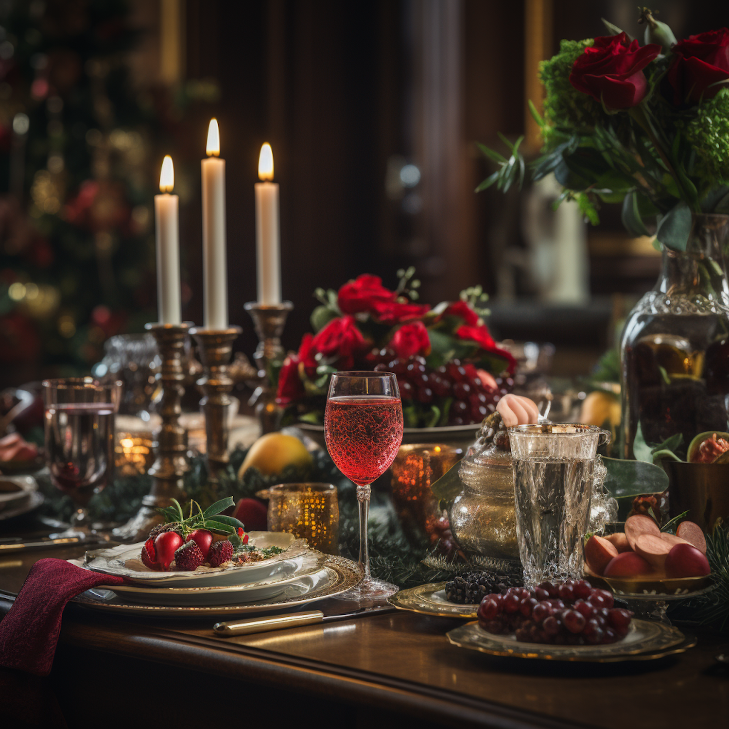 Elegant dining table with red wine, roses, and candles, creating a festive and luxurious atmosphere.