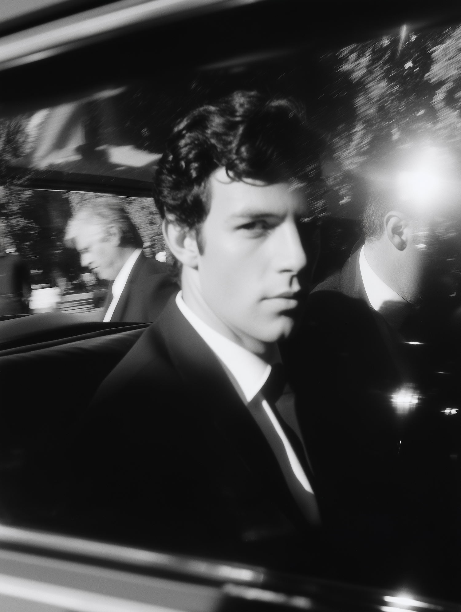 Black-and-white photo of a man in a suit sitting in a car, gazing out the window with a serious expression. Dramatic and cinematic vibe.