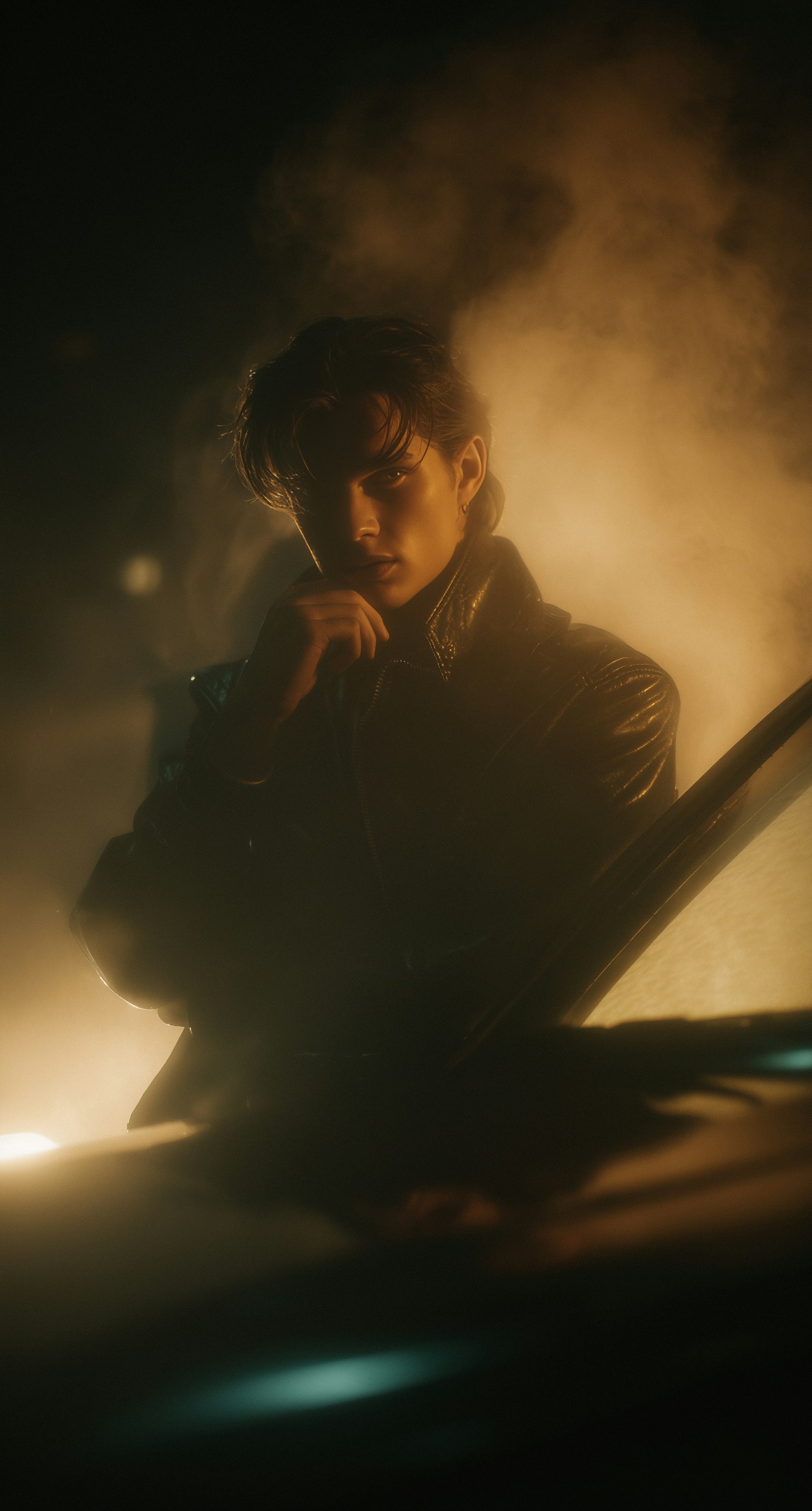A cinematic portrait of a person in a leather jacket, surrounded by warm, smoky lighting, creating a mysterious and dramatic atmosphere.