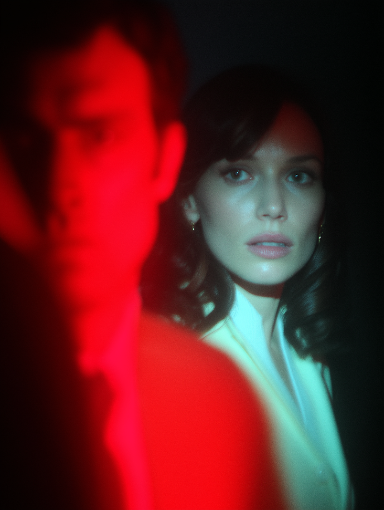 Moody portrait with dramatic red lighting, featuring a blurred man in the foreground and a focused woman with wavy hair in the background.