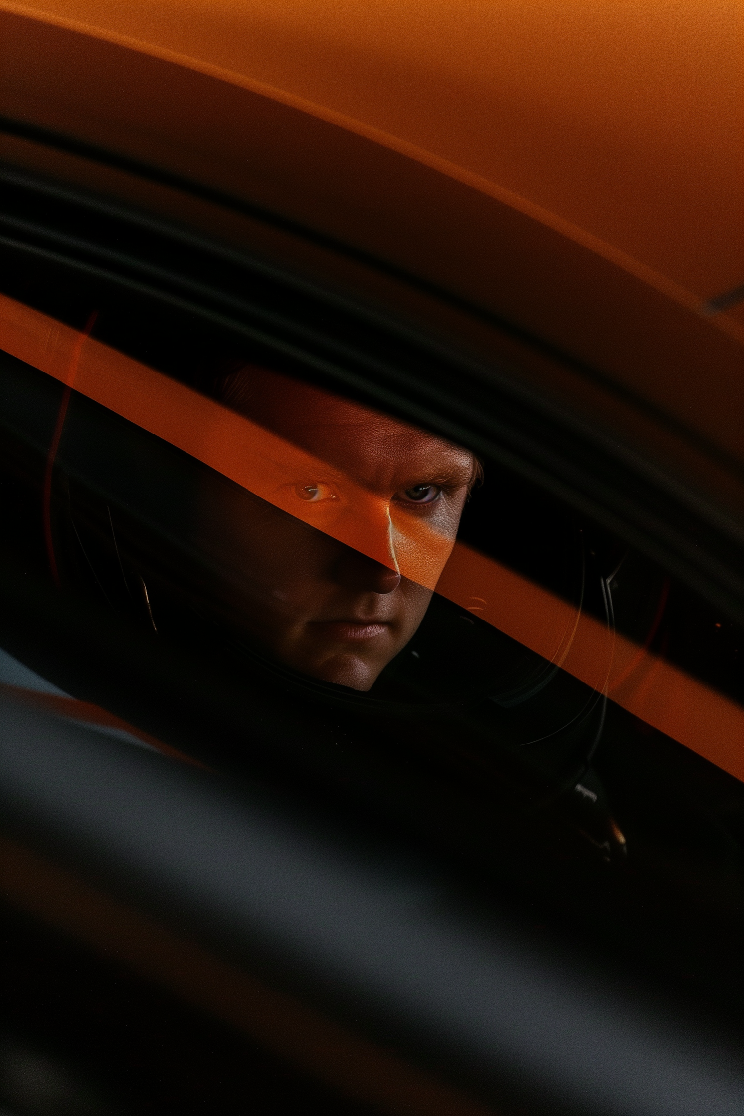 A dramatic portrait of a person seen through a car window, with striking orange lighting and a serious expression.