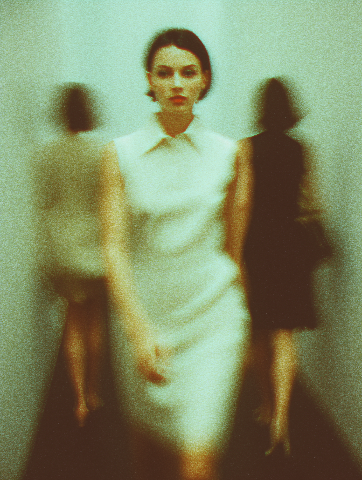 A woman in a white dress walks down a hallway with blurred figures in the background, creating a vintage, cinematic vibe.