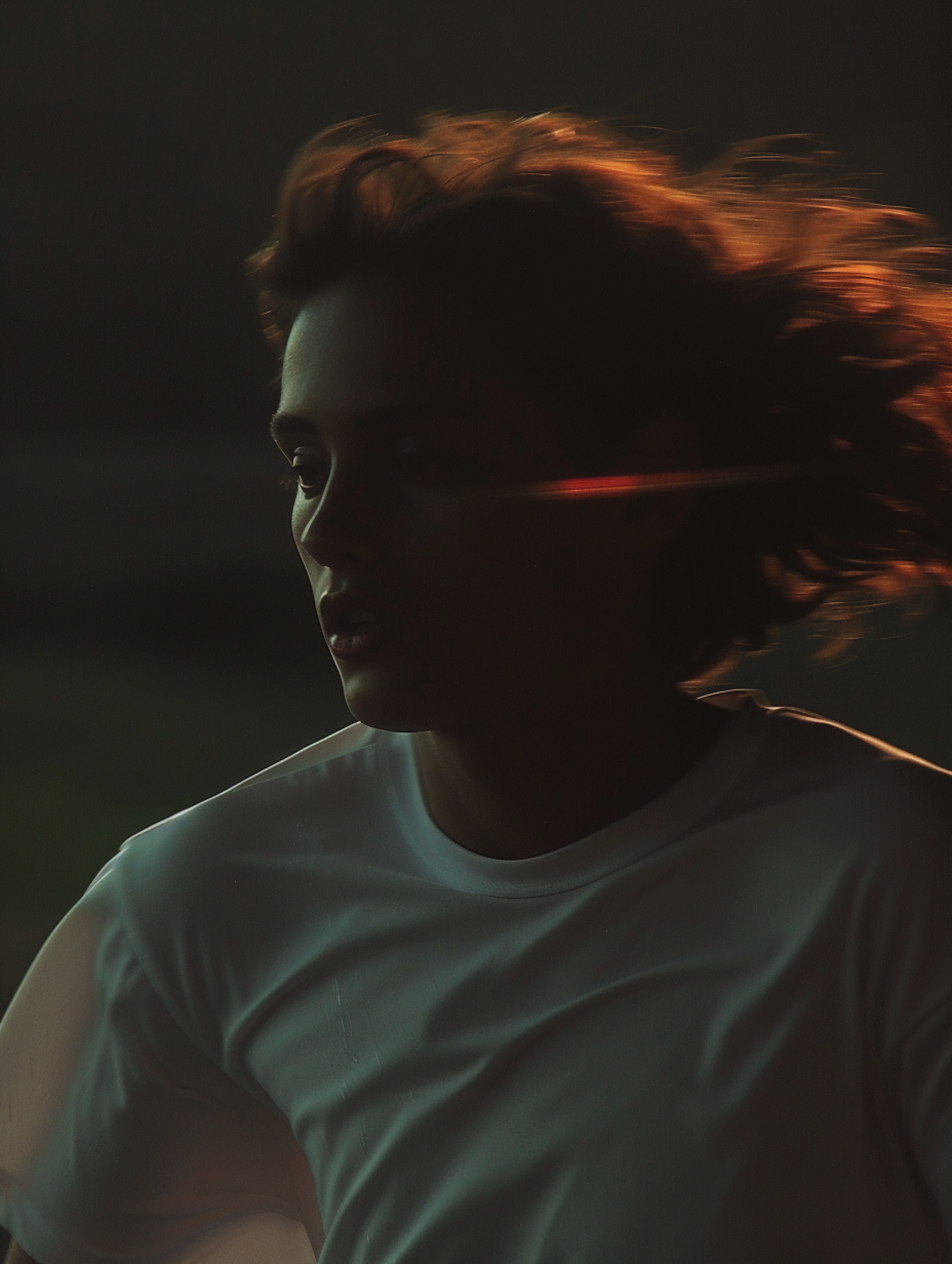 Moody portrait of a person in motion, with dramatic lighting highlighting their hair and white t-shirt against a dark background.
