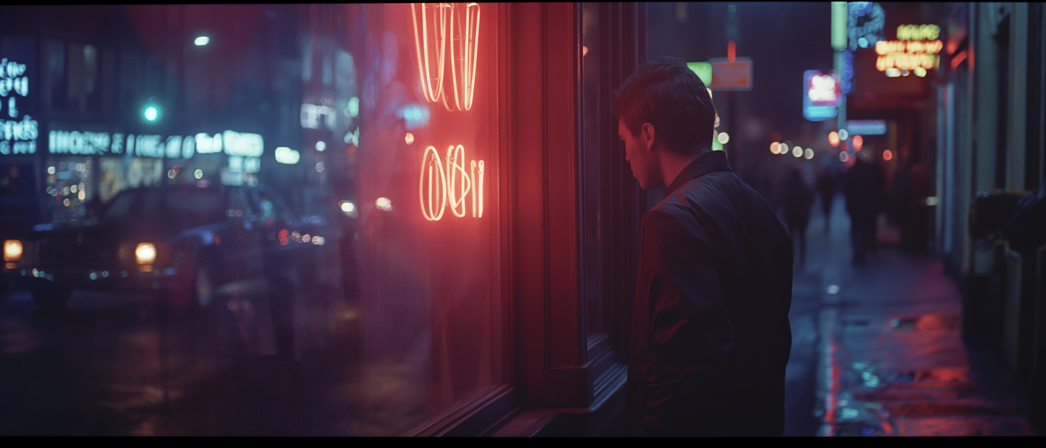 Moody night scene with a man gazing at a neon-lit shop window on a rainy street, capturing urban solitude and vibrant reflections.