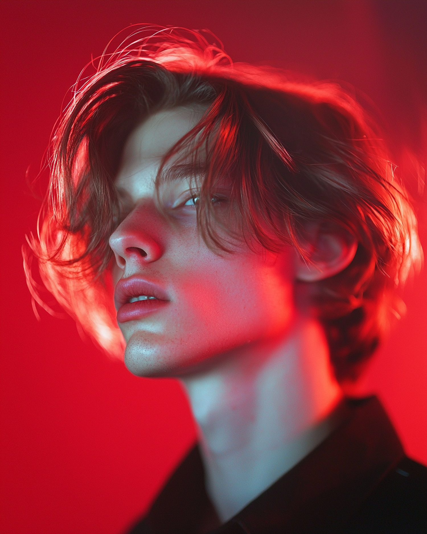 Close-up of a young person with wavy auburn hair and dramatic red lighting, creating a cinematic and moody atmosphere.