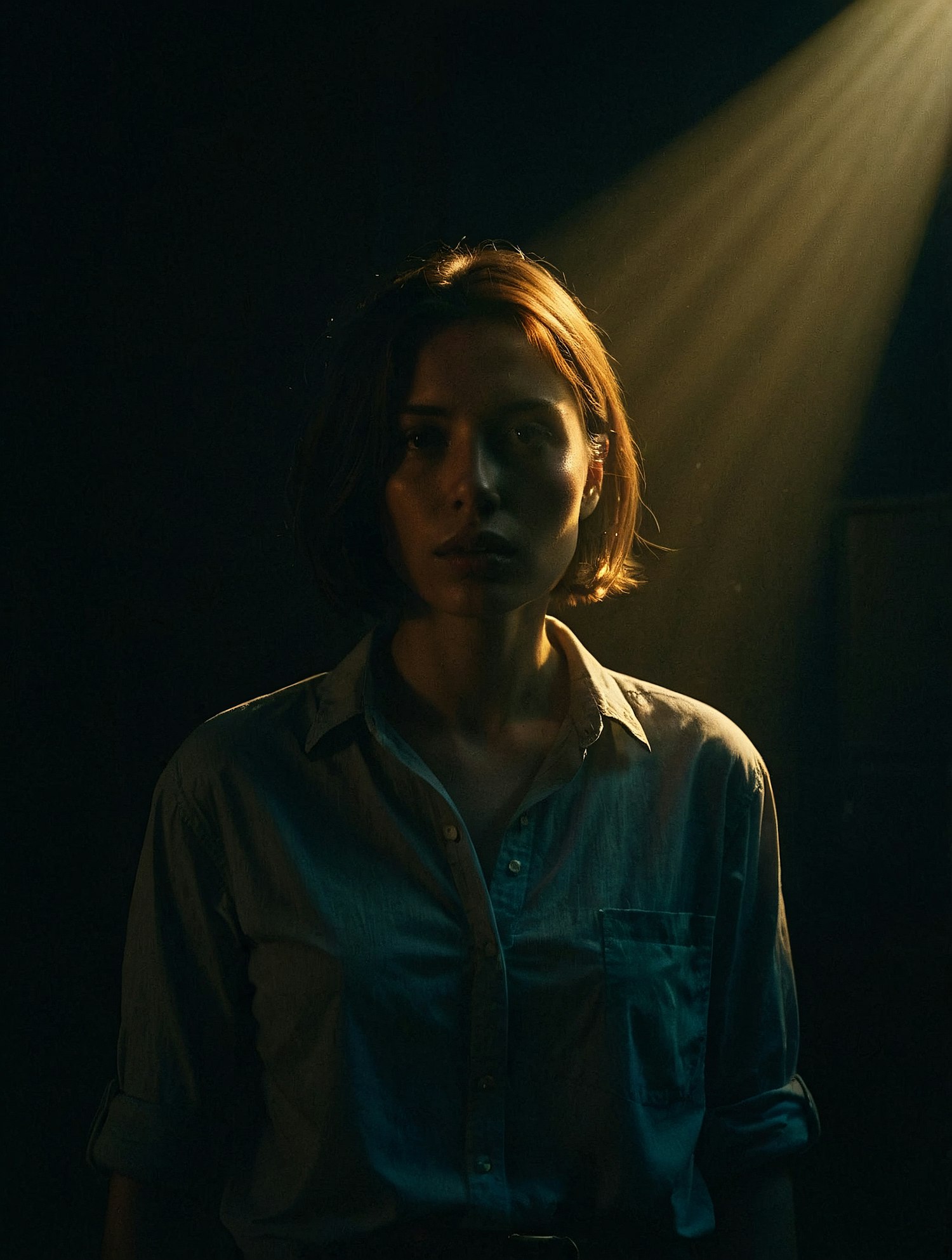 A woman with short auburn hair in a dimly lit room, illuminated by a dramatic beam of light, creating a cinematic and mysterious vibe.