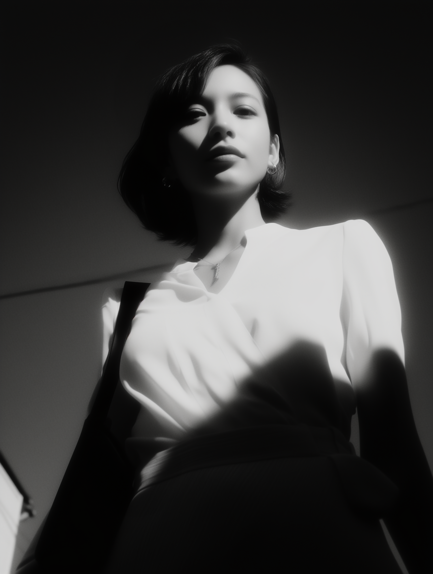 Monochrome portrait of a woman in dramatic lighting, showcasing her confident expression and elegant attire.