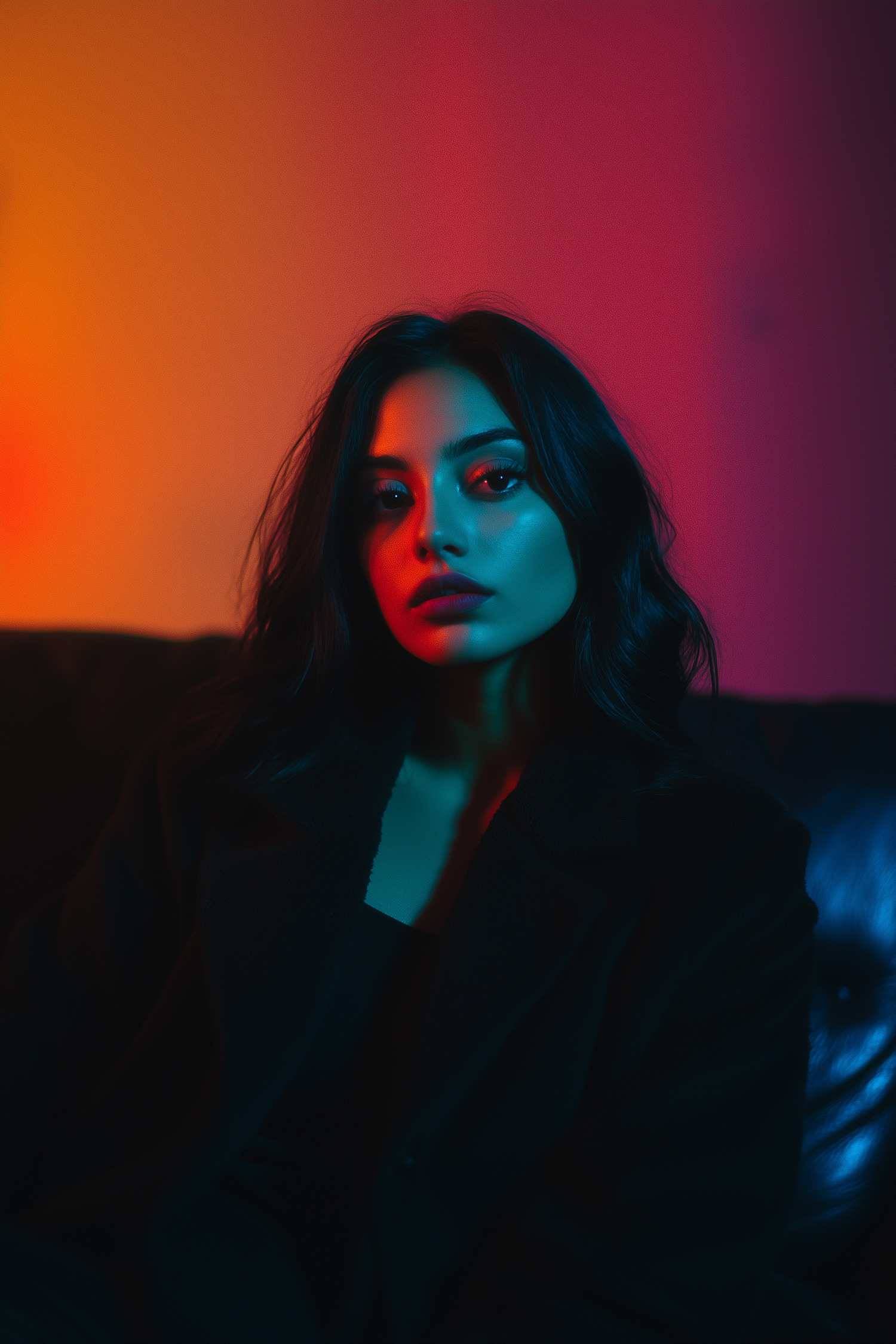 A young woman in dramatic teal and red lighting sits against a vibrant gradient background, creating a moody and artistic atmosphere.