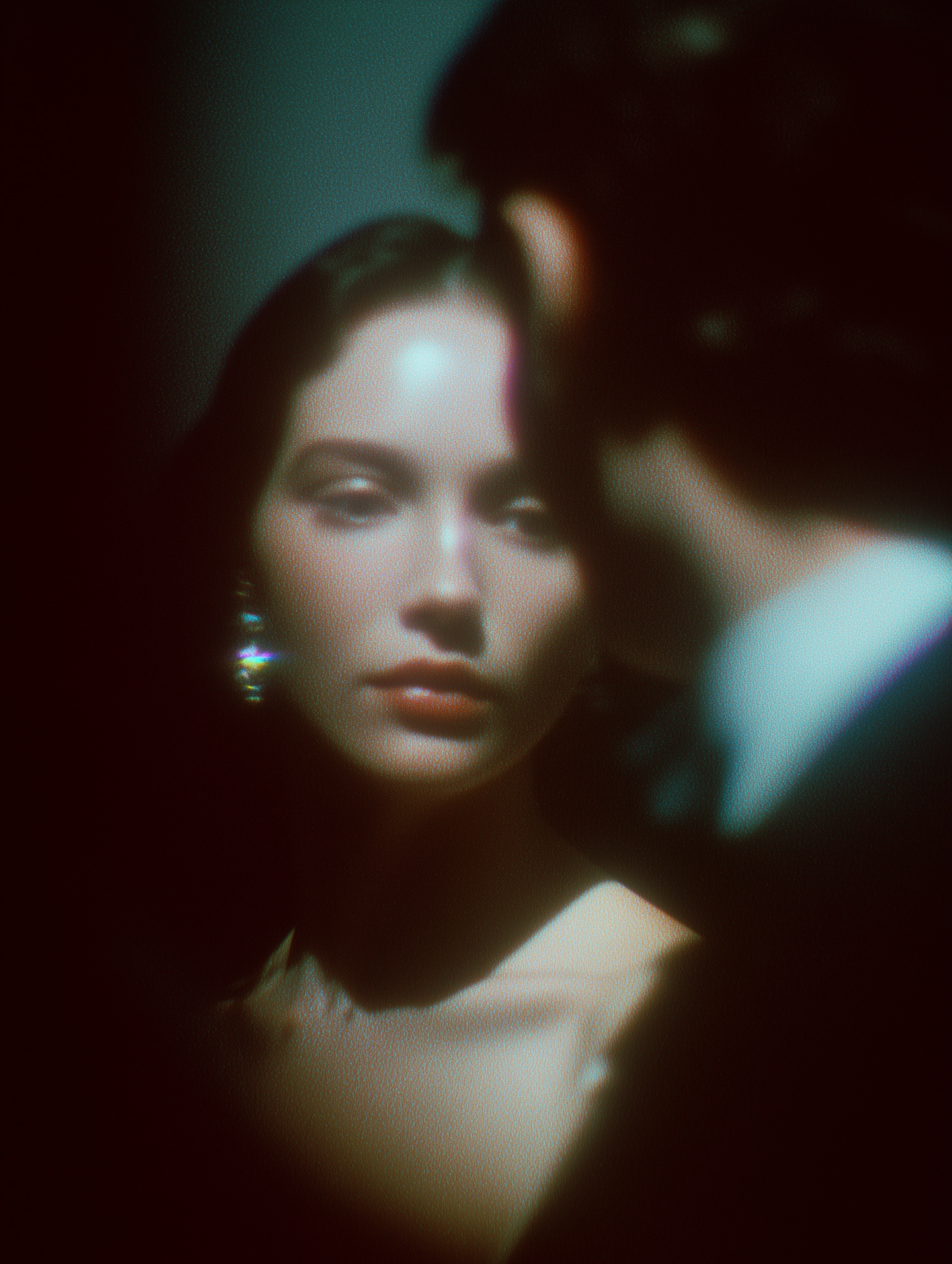Moody cinematic portrait of a woman in soft light, with a blurred male silhouette in the foreground adding depth and intrigue.