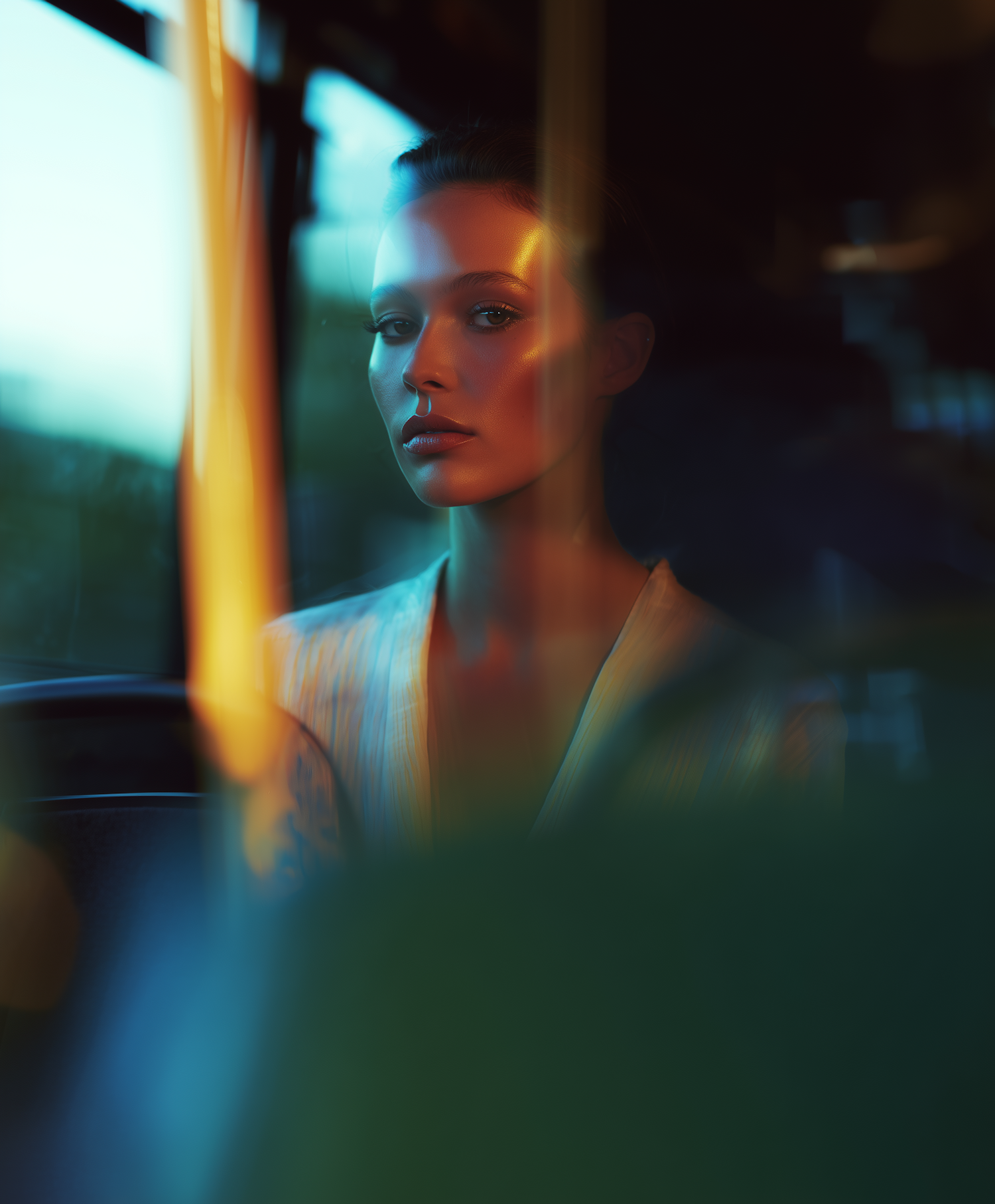A woman in soft lighting with a blurred background, creating a cinematic and introspective atmosphere.