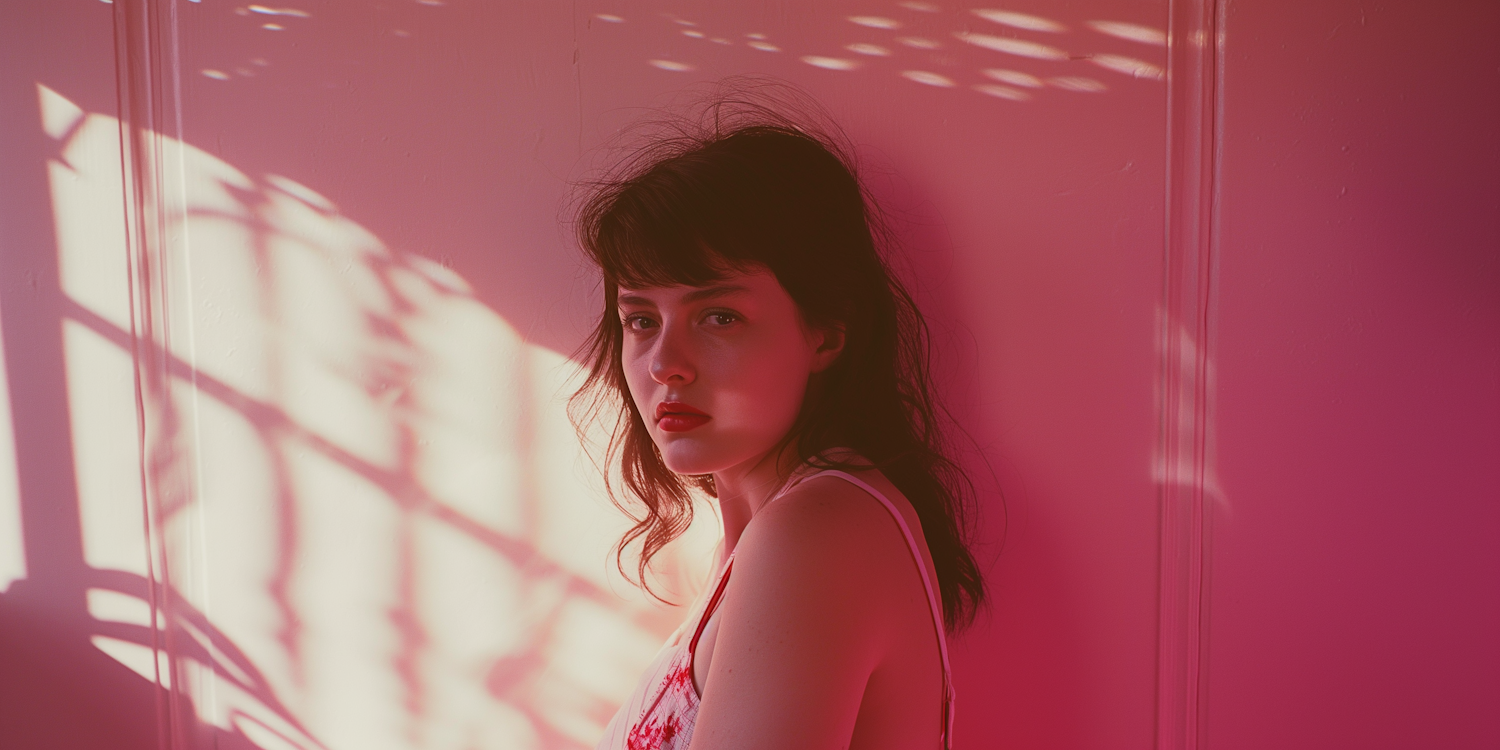A young woman with dark hair and red lips stands against a pink-lit wall, creating a serene and artistic atmosphere.