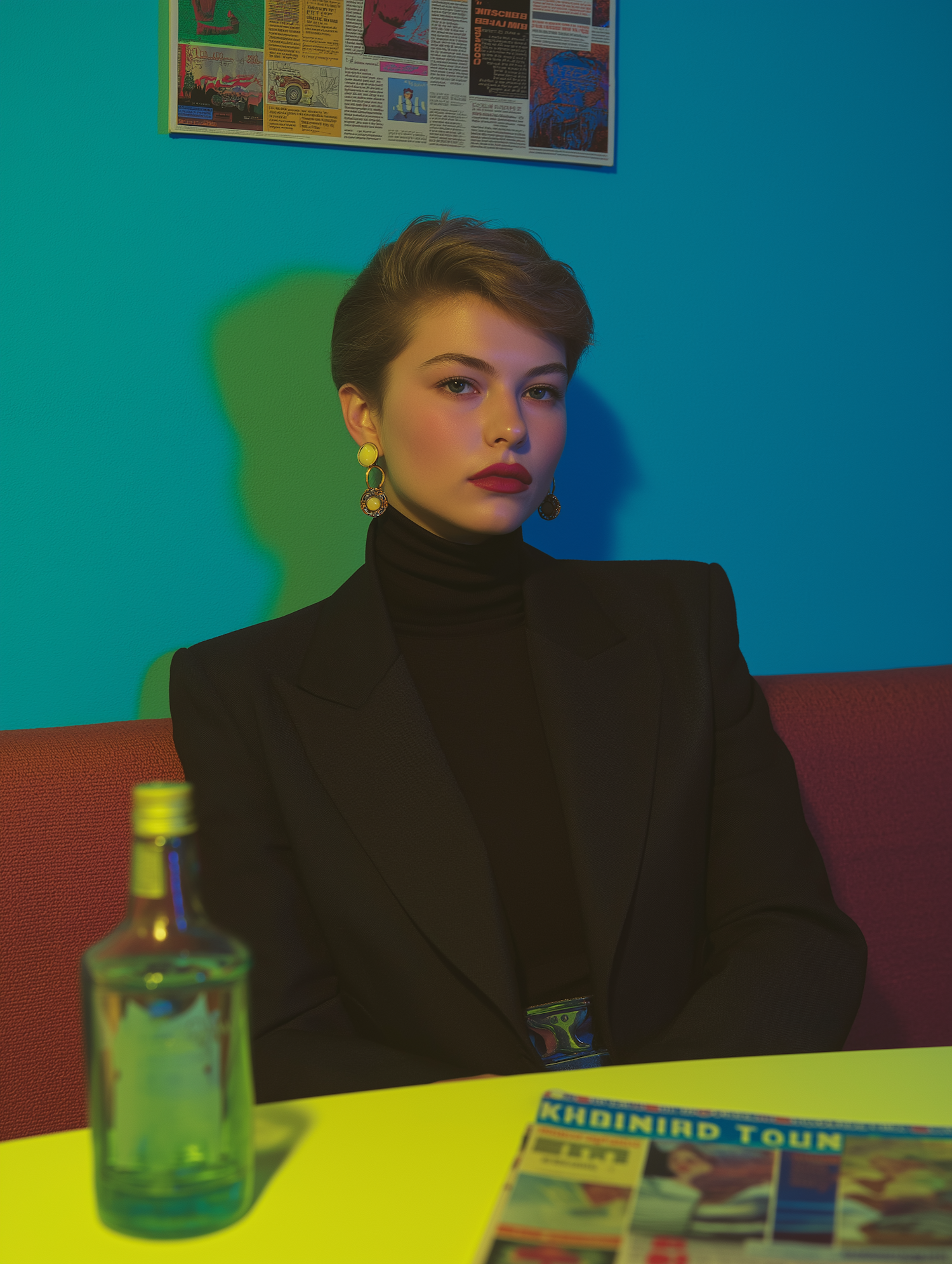 Stylish individual in a black blazer sits in vibrant lighting, with a green bottle and magazine on the table, evoking a retro vibe.