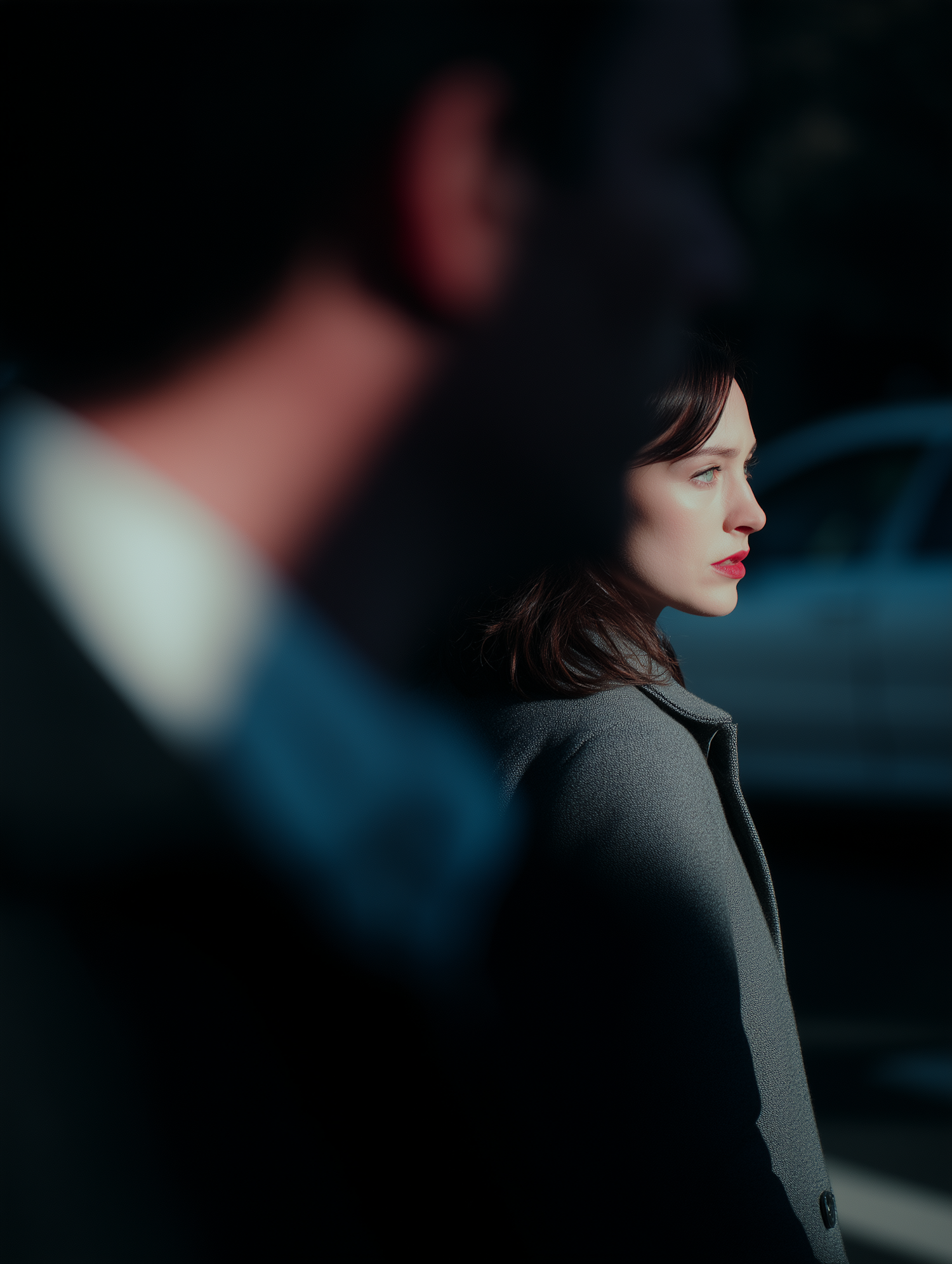 Cinematic shot of a woman in a gray coat, illuminated by soft light, with a blurred male silhouette in the foreground.
