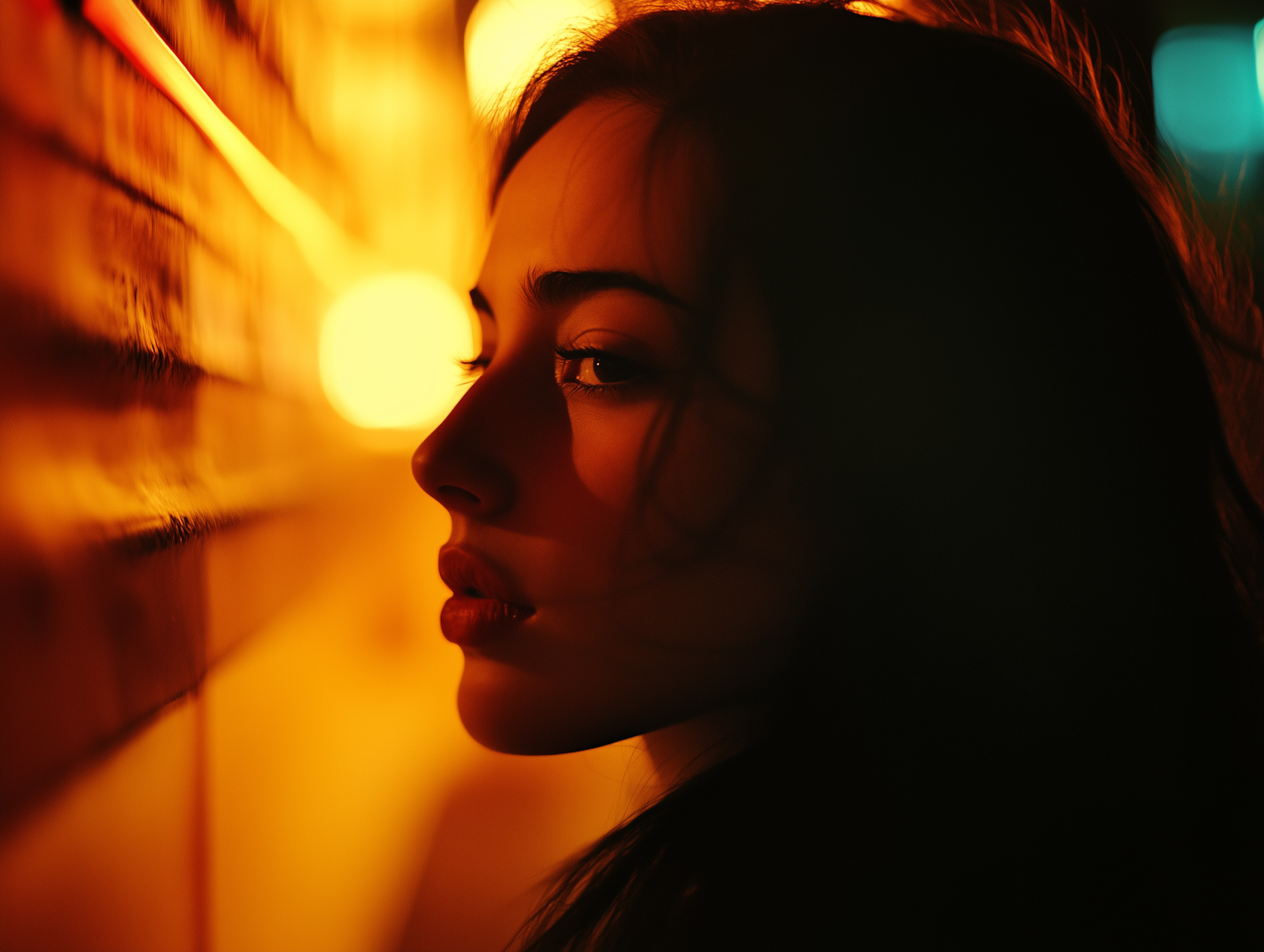 Moody close-up of a young woman in warm golden lighting, with a blurred background and a contemplative expression.