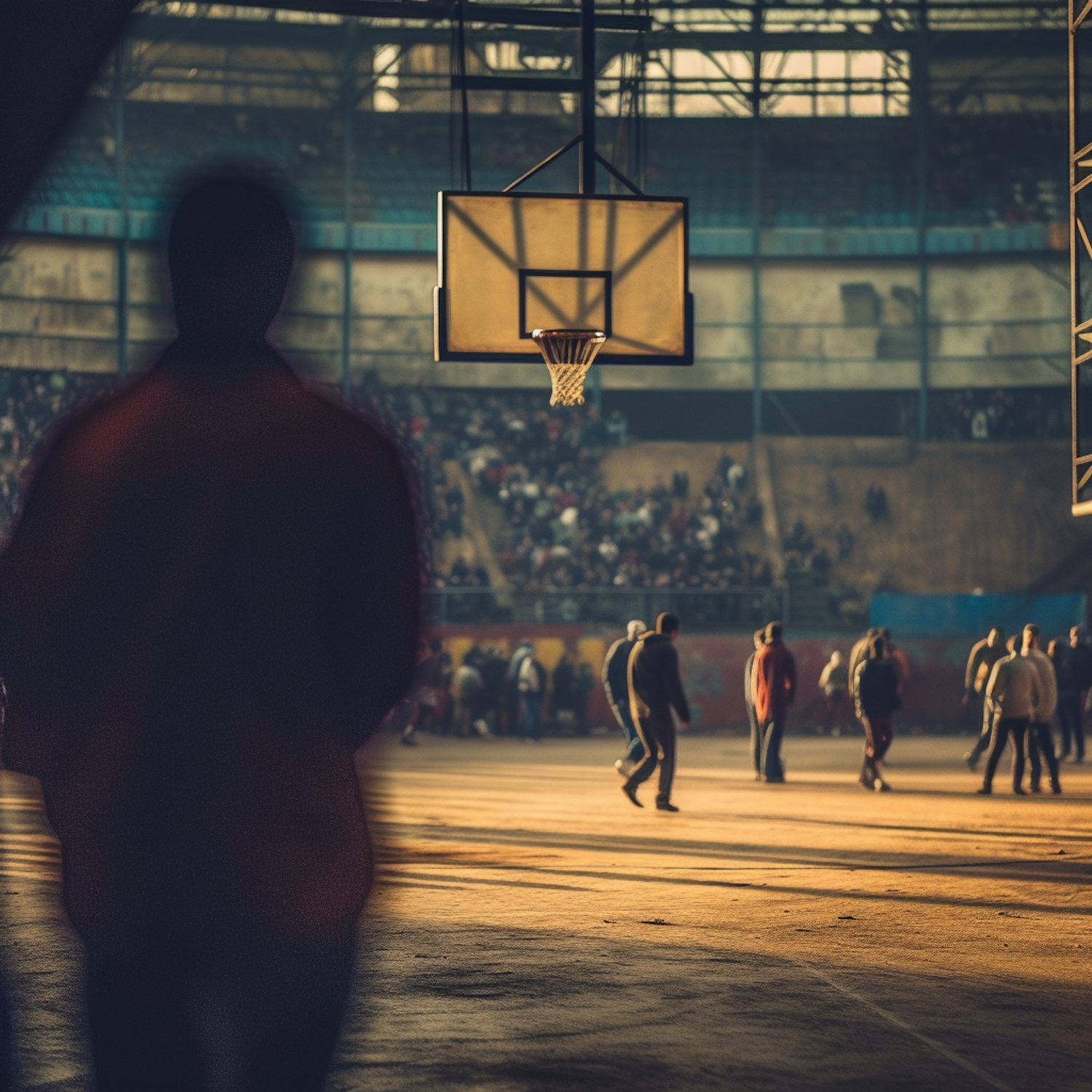 Golden-lit basketball court with a hoop, scattered players, and a crowd in the stands, creating a nostalgic and cinematic atmosphere.