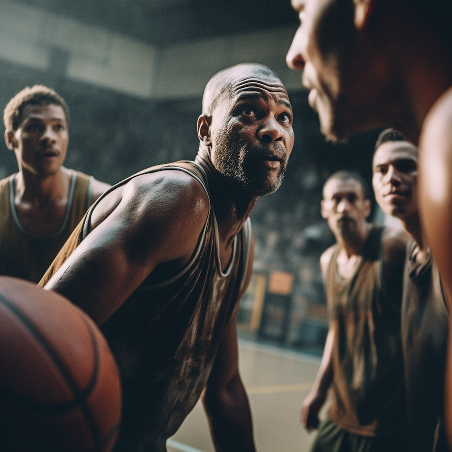 Intense basketball game with focused players on an indoor court, highlighting teamwork and competition.