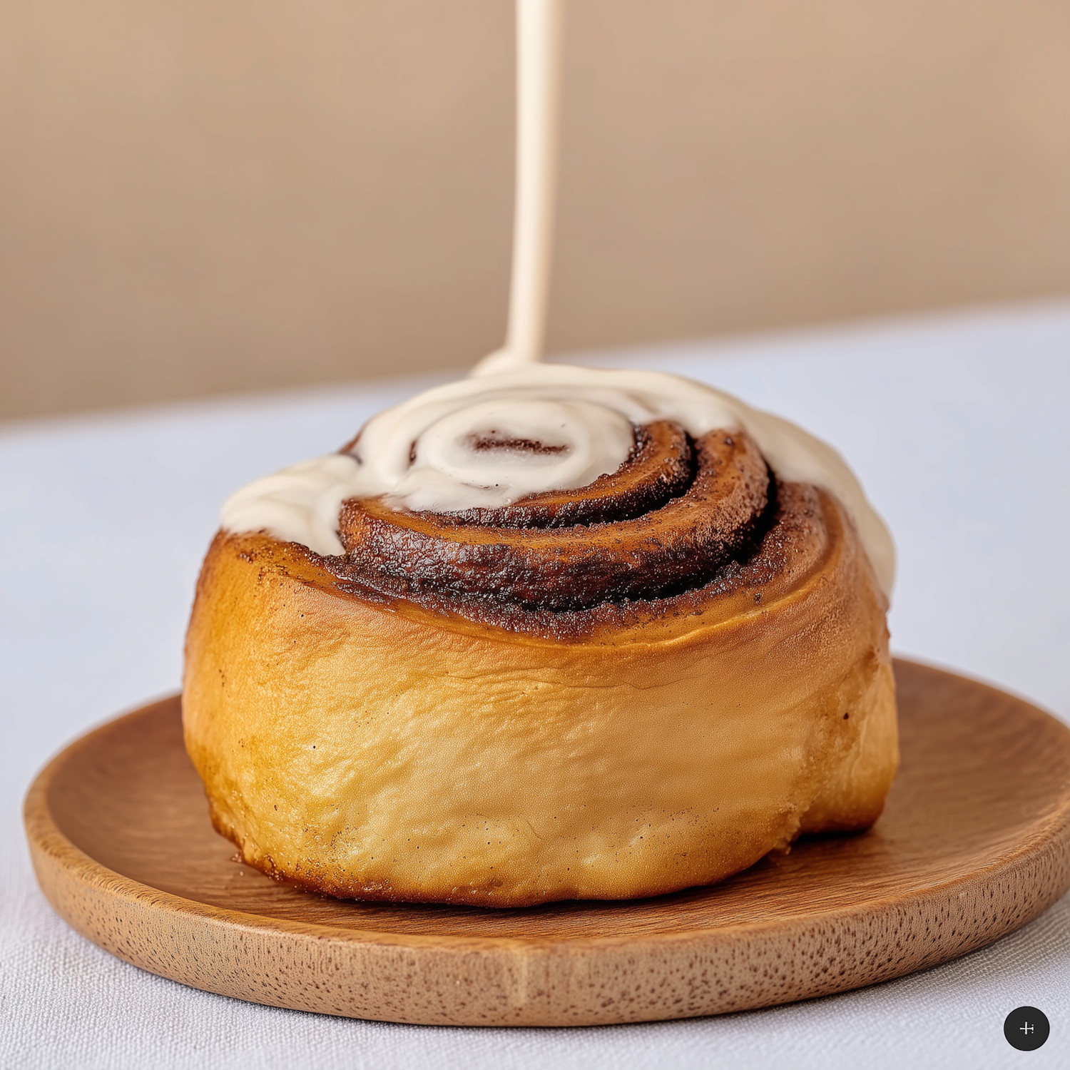 Freshly baked cinnamon roll with golden crust and creamy icing drizzle, served on a wooden plate. Perfect for dessert lovers!