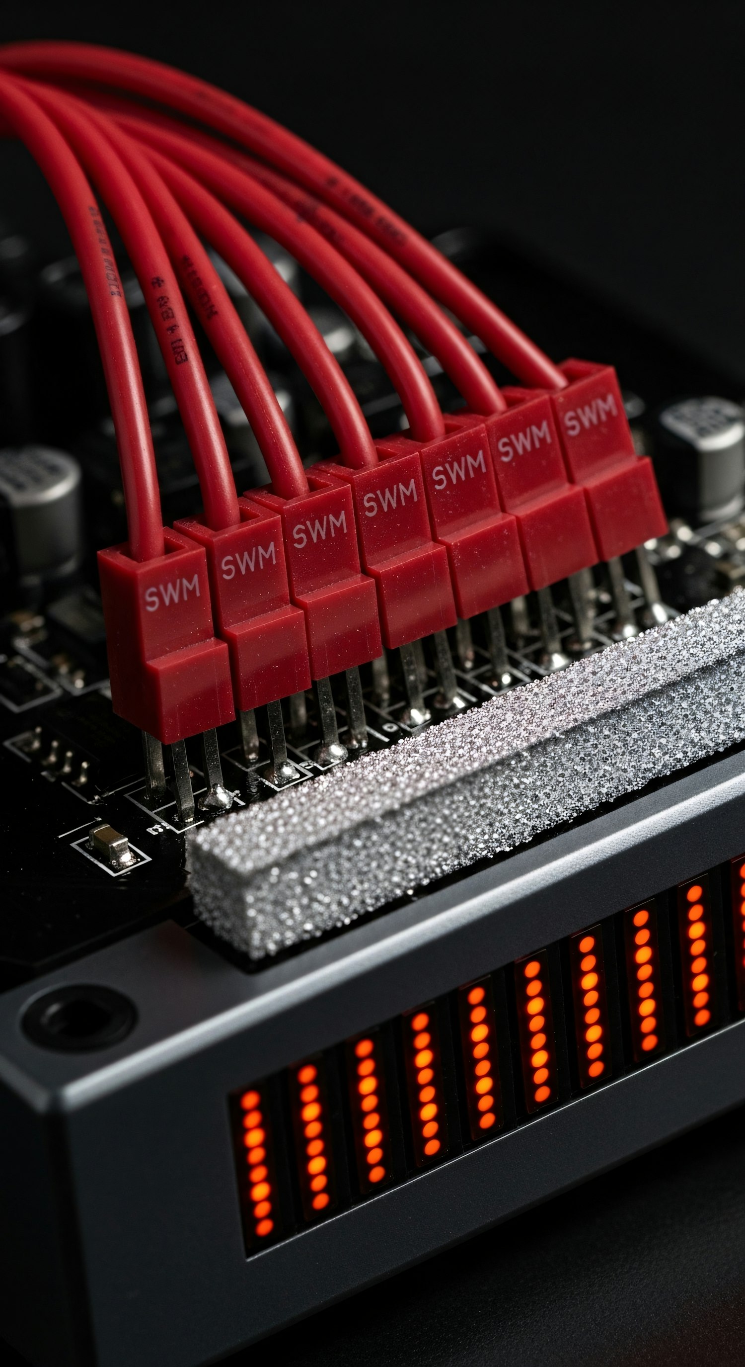 Close-up of a circuit board with red connectors, red wires, and a digital display with orange LED bars, showcasing intricate electronics.