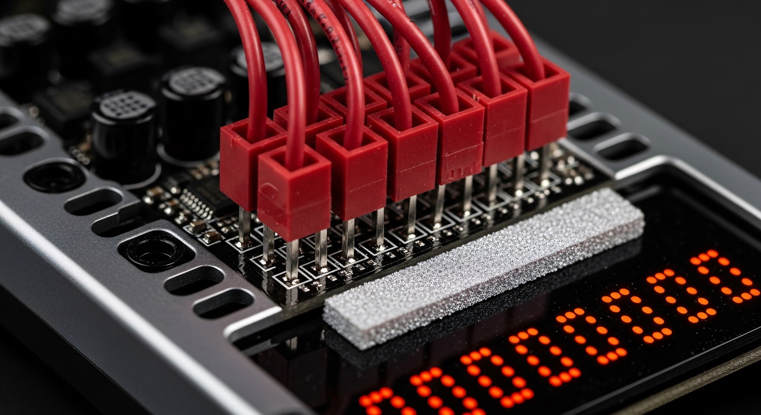 Close-up of a circuit board with red connectors, wires, and a digital display showing red numbers, showcasing intricate electronic details.