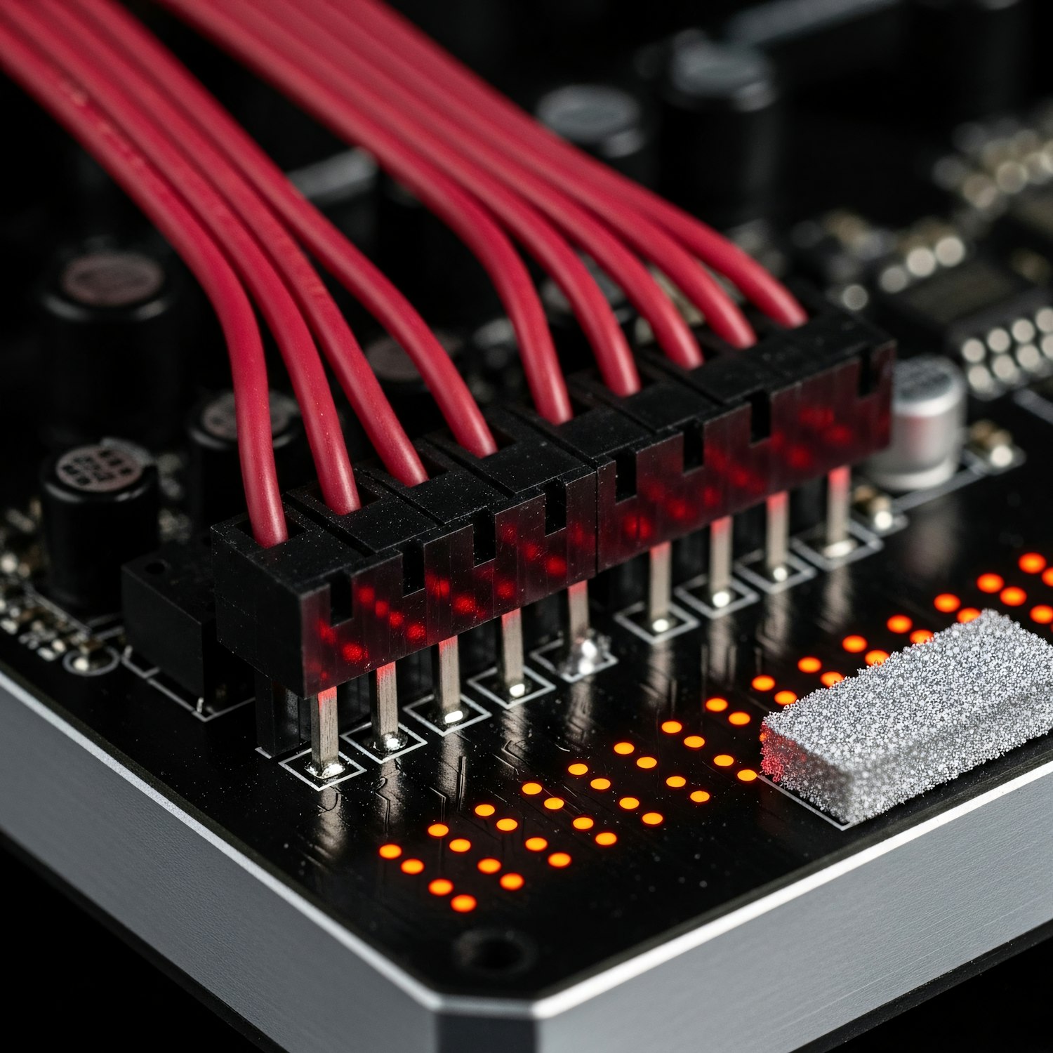 Close-up of a circuit board with red wires, black connectors, and glowing orange LEDs, showcasing intricate electronic details.