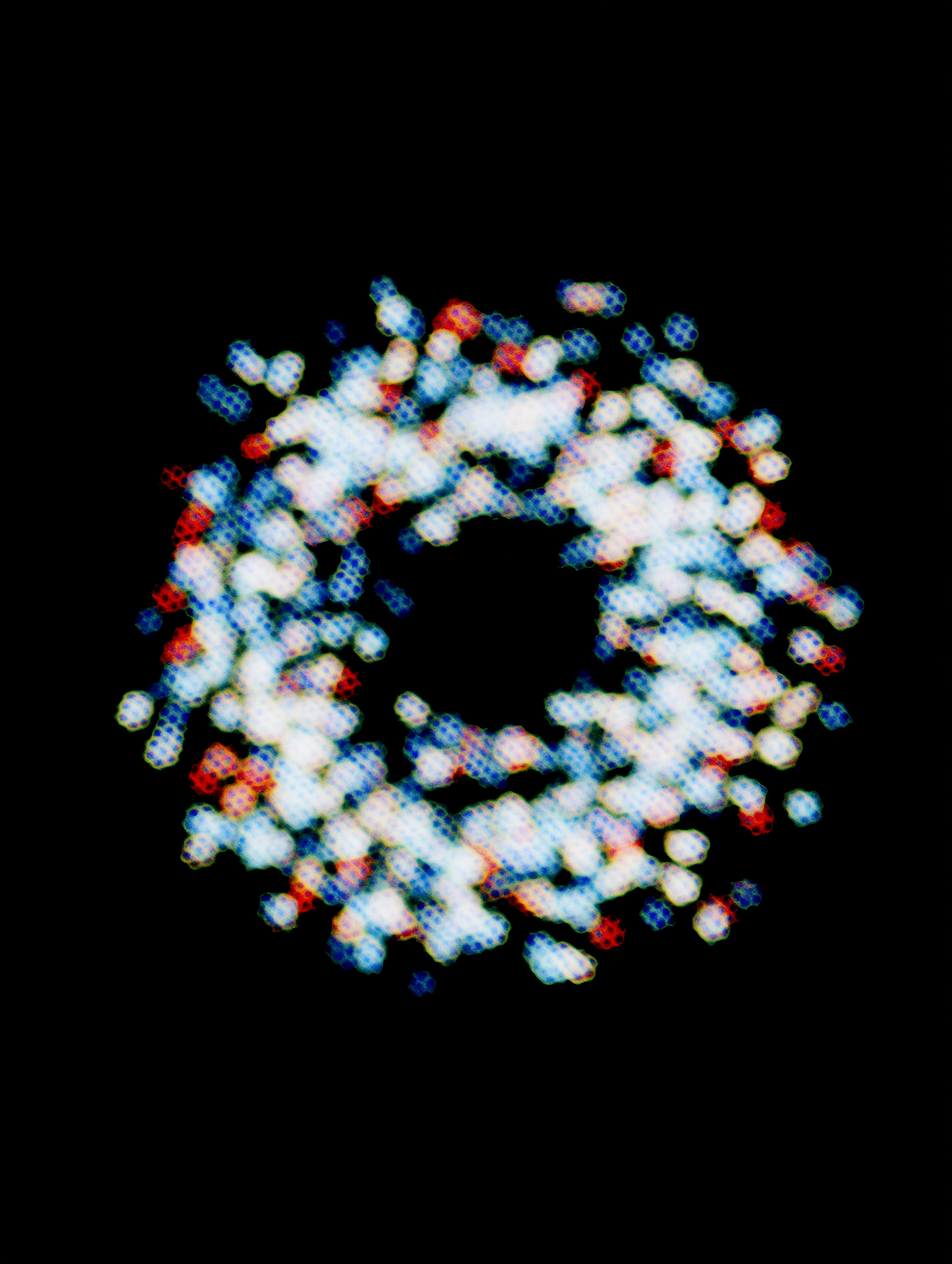 Abstract circular pattern of blurred, multicolored lights on a black background, creating a vibrant and pixelated digital effect.