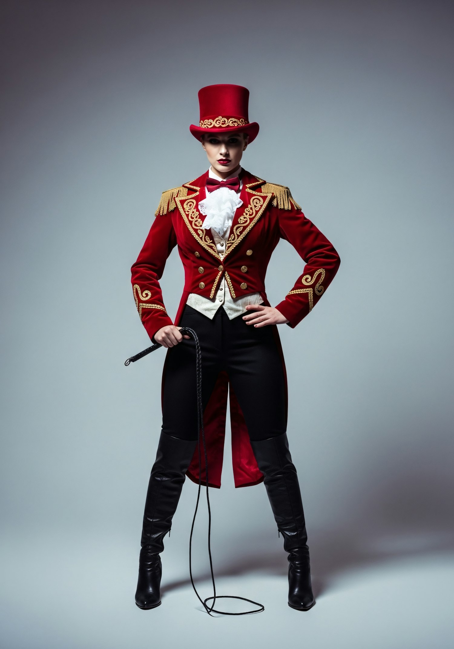 A person in a red and gold ringmaster costume with a top hat and whip, standing confidently against a neutral background.