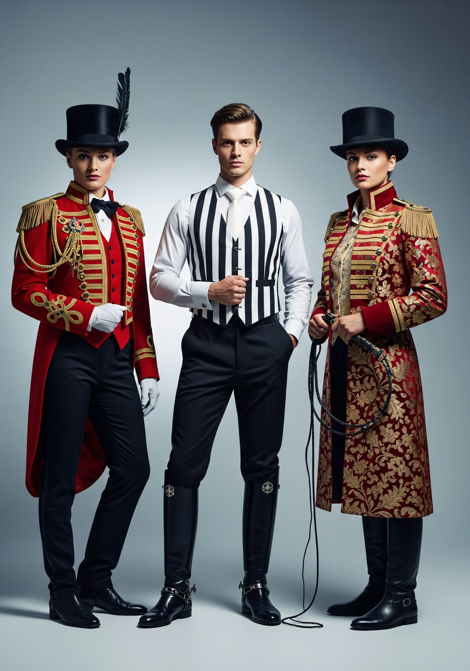 Three individuals in ornate, circus-inspired attire stand confidently, showcasing detailed red and gold coats and a striped vest.