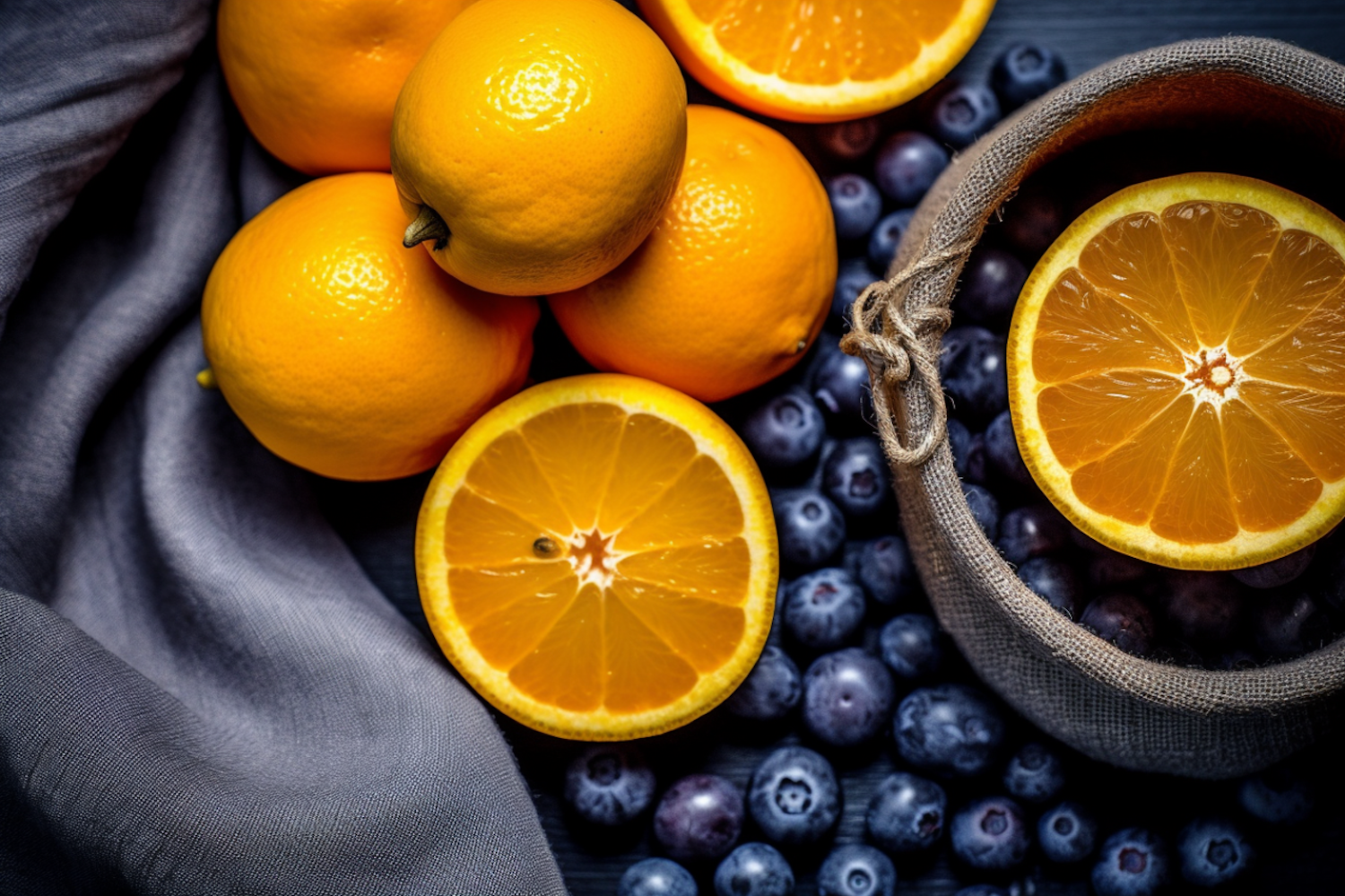 Vibrant oranges and blueberries on a dark surface with a rustic burlap sack and soft gray fabric, highlighting fresh textures and colors.