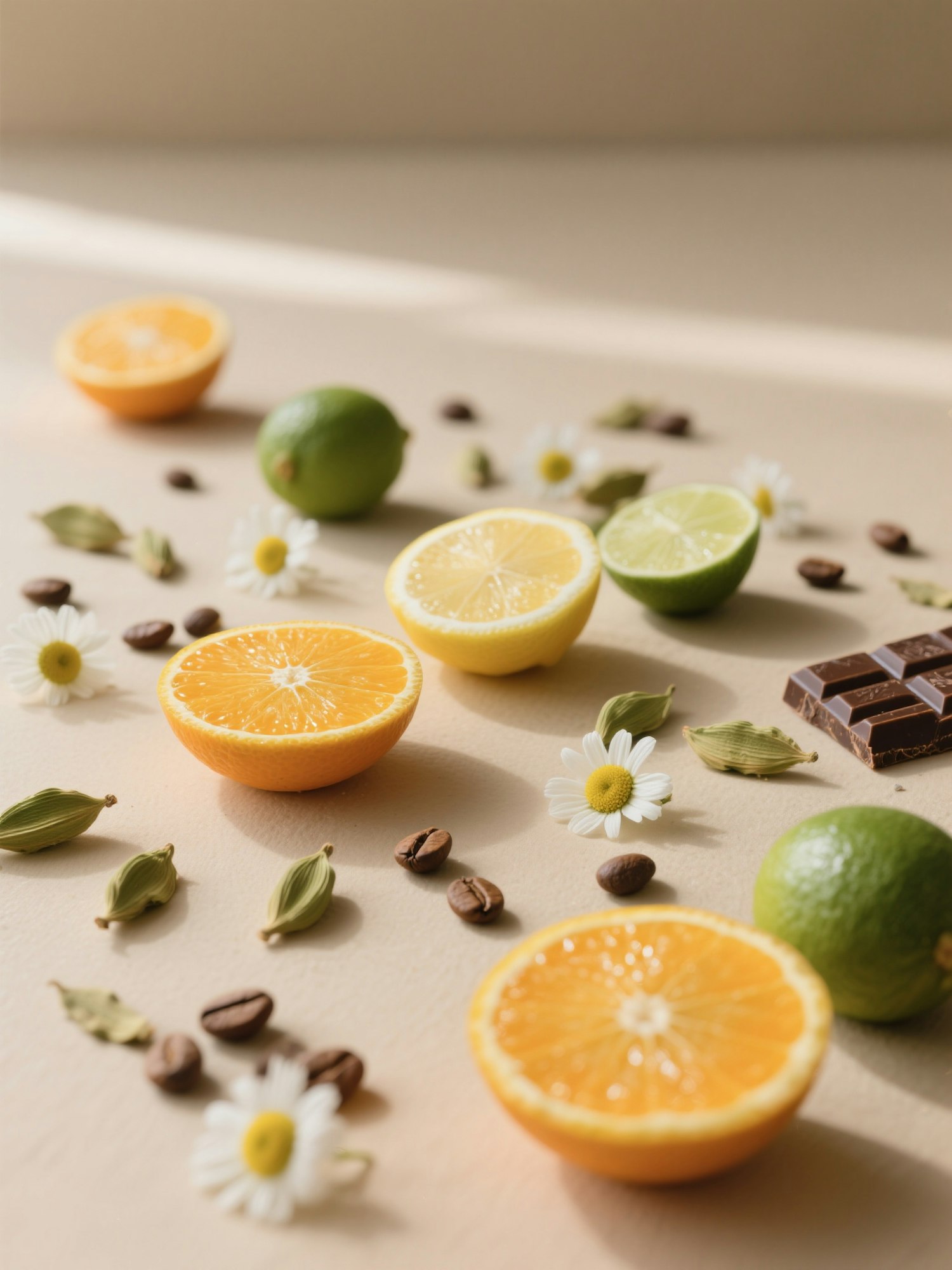 Bright citrus fruits, coffee beans, chamomile flowers, and chocolate arranged beautifully on a beige surface with soft natural lighting.
