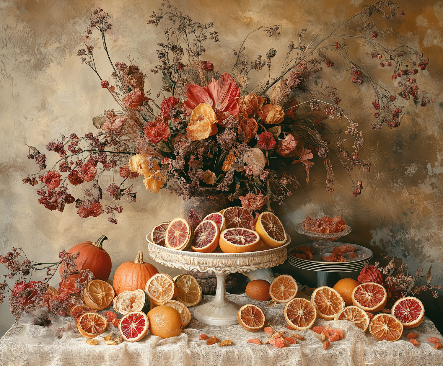 Elegant still life with sliced citrus fruits, dried flowers, and pumpkins on a decorative pedestal, set against a warm textured background.