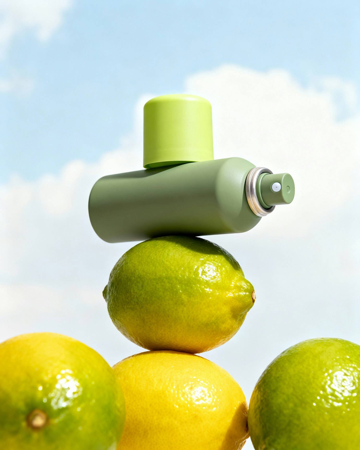 A green spray bottle balanced on lemons and limes against a bright sky, showcasing freshness and vibrant colors in a minimalistic composition.