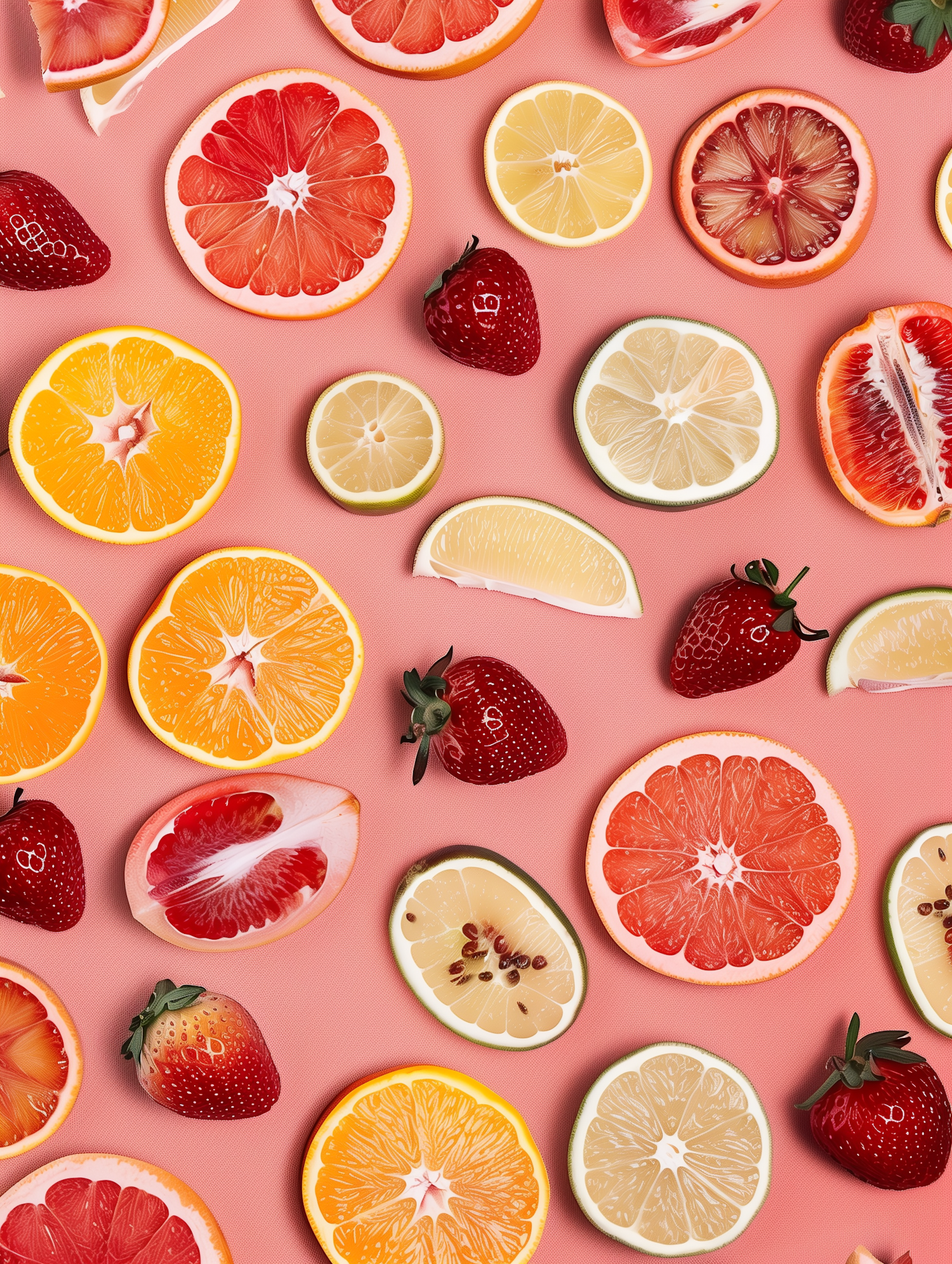 Bright citrus slices and strawberries on a pink background create a colorful, fresh, and vibrant flat lay perfect for food lovers.