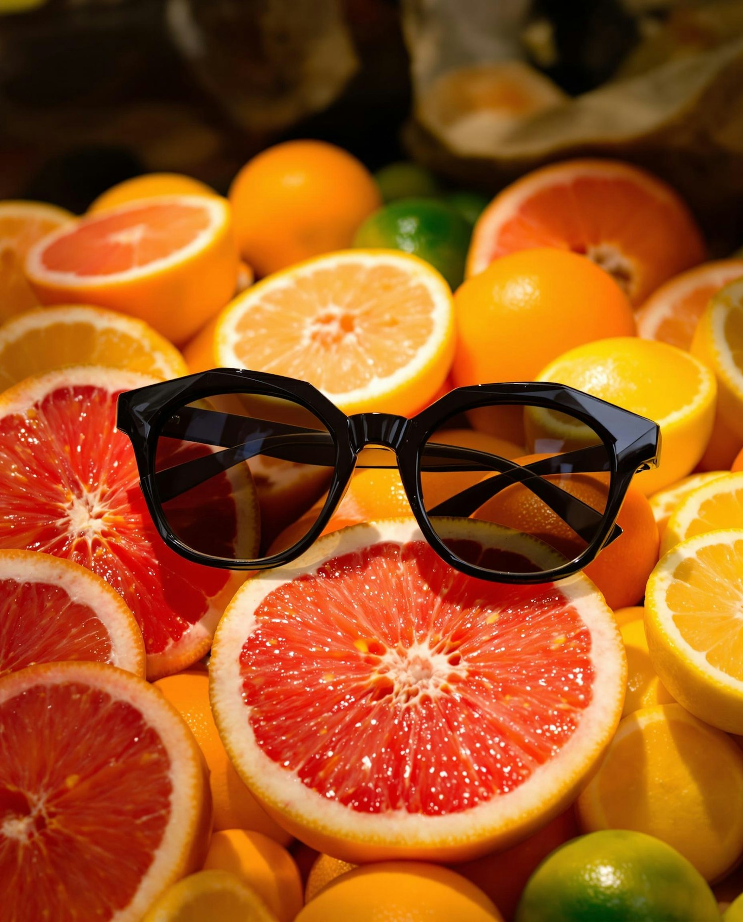 Black geometric sunglasses displayed on a pile of cut citrus fruits: grapefruits, oranges, lemons and limes, with vibrant colors and natural glisten under harsh light
