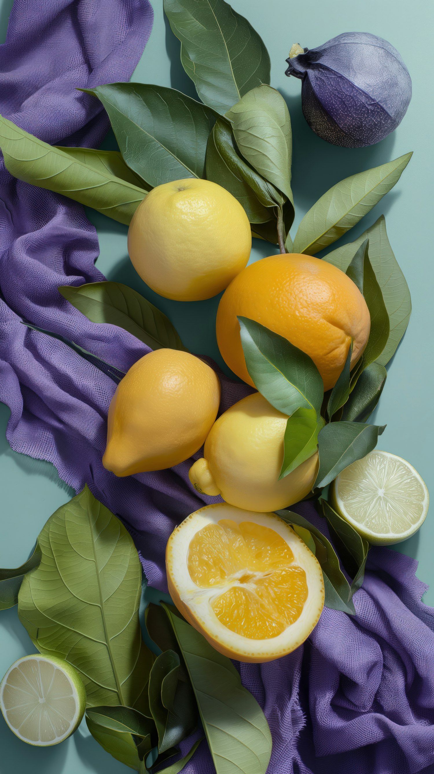 Vibrant citrus fruits with green leaves on a teal background, accented by a purple cloth and a unique purple fruit.