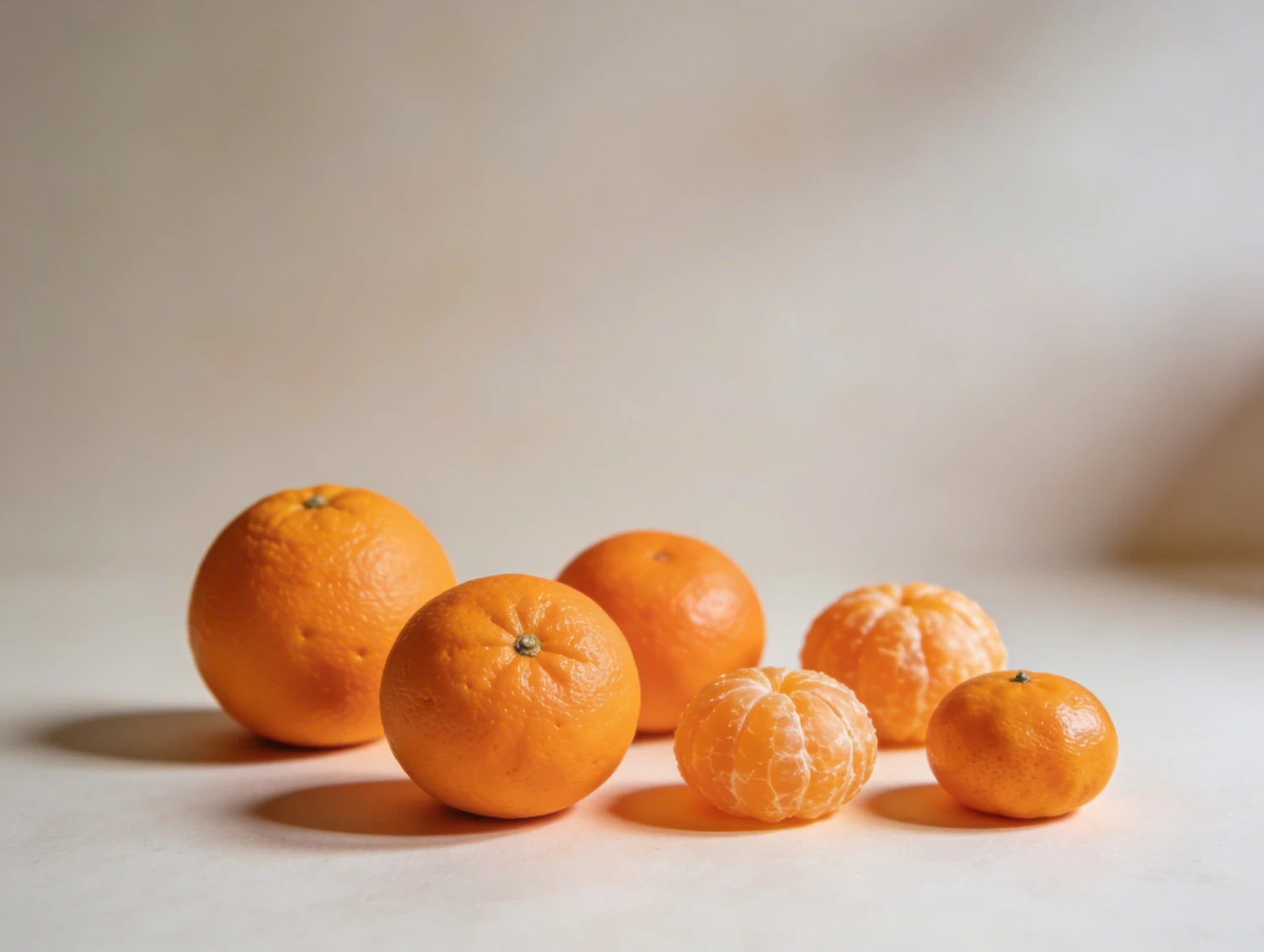 A variety of oranges and mandarins, some peeled, arranged on a light surface with soft lighting highlighting their textures.