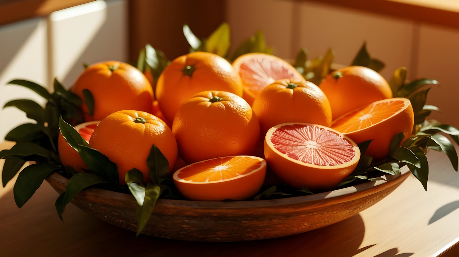 A wooden bowl of fresh oranges and halved grapefruits with green leaves, bathed in warm sunlight on a wooden table.