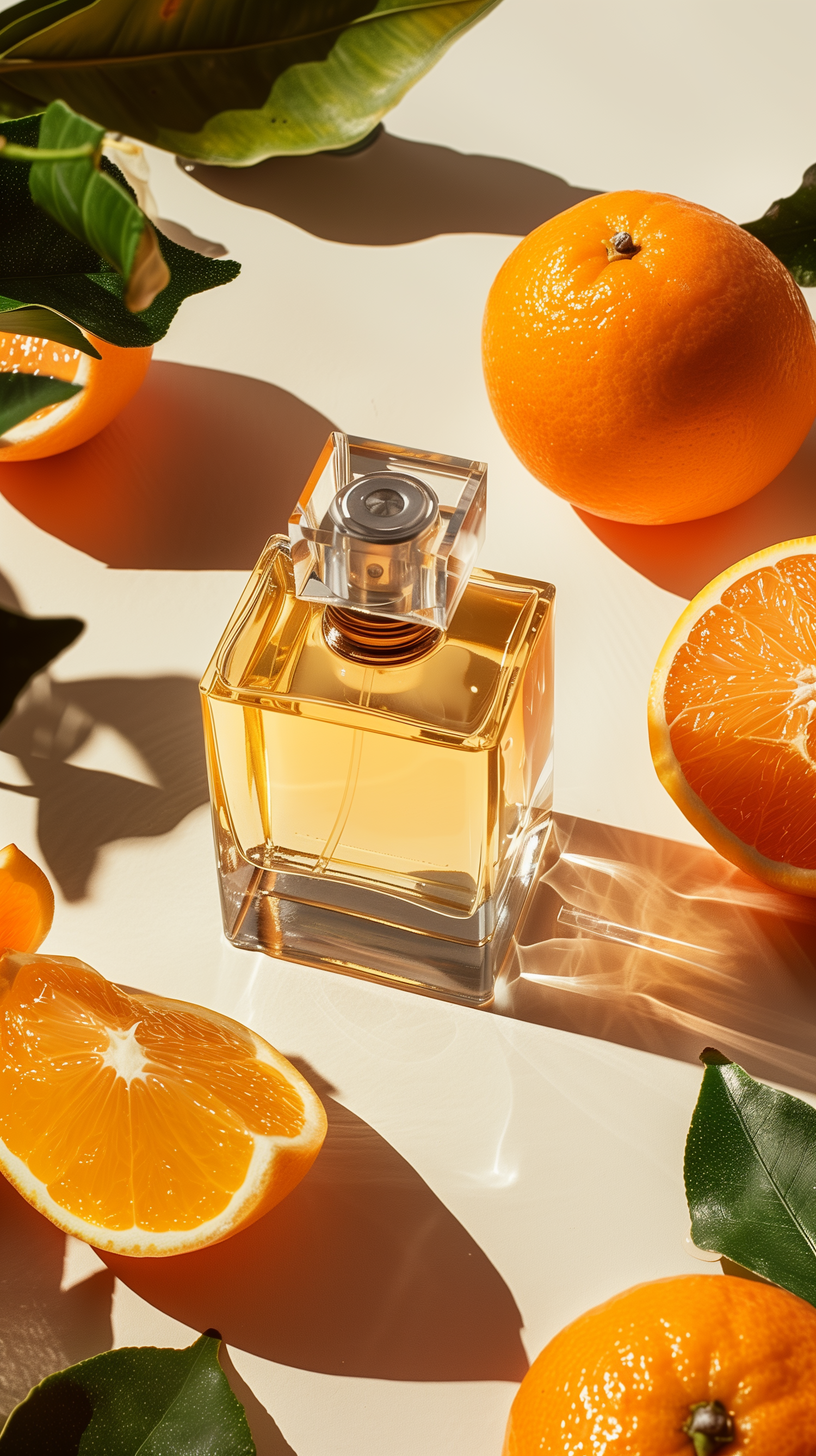 A golden perfume bottle surrounded by fresh oranges and green leaves, bathed in warm sunlight for a vibrant, citrusy aesthetic.