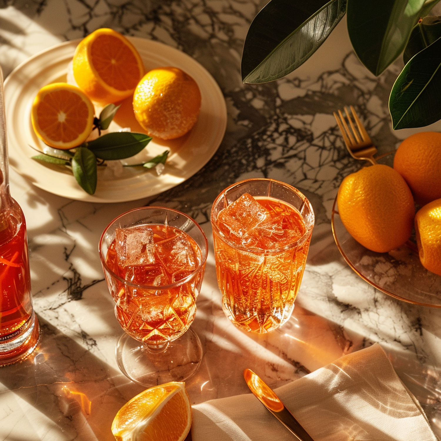Elegant orange cocktails with ice on a marble table, surrounded by fresh oranges and sunlight, creating a warm, inviting scene.