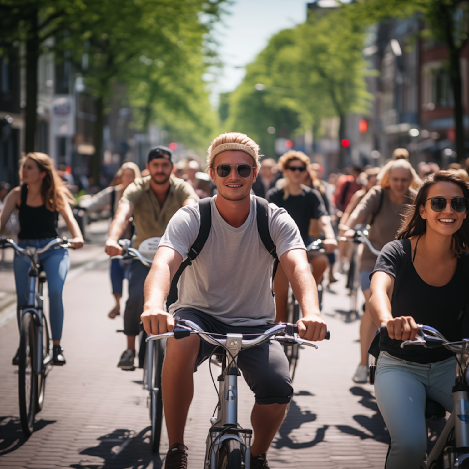 A vibrant group of cyclists enjoying a sunny ride down a tree-lined urban street, capturing the essence of community and outdoor fun.
