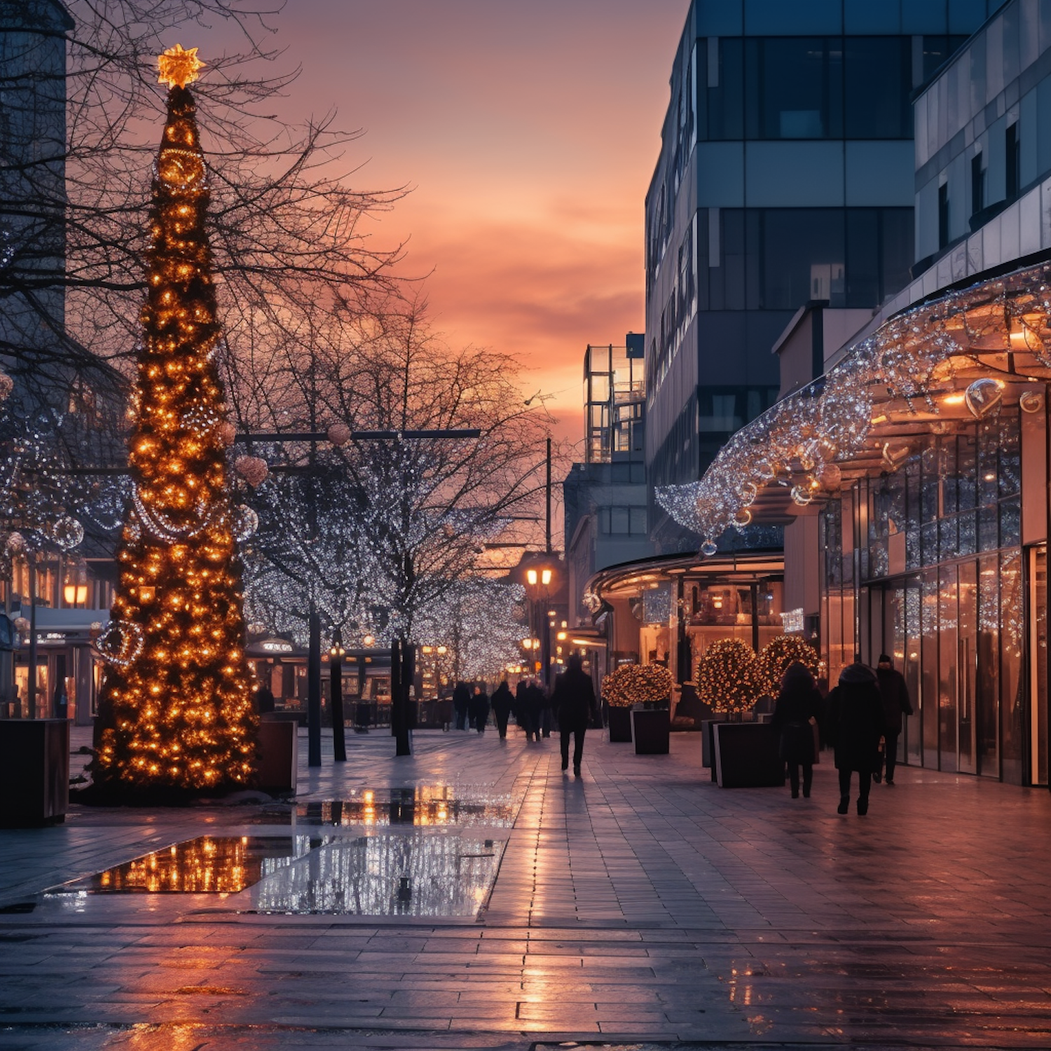 Festive city street at dusk with a glowing Christmas tree, decorated buildings, and a vibrant sunset sky.
