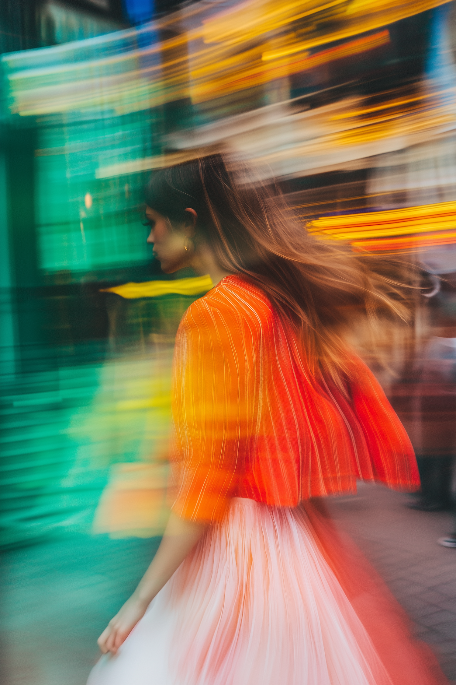 A vibrant motion blur photo of a woman in an orange top and white skirt walking through a colorful cityscape at night.