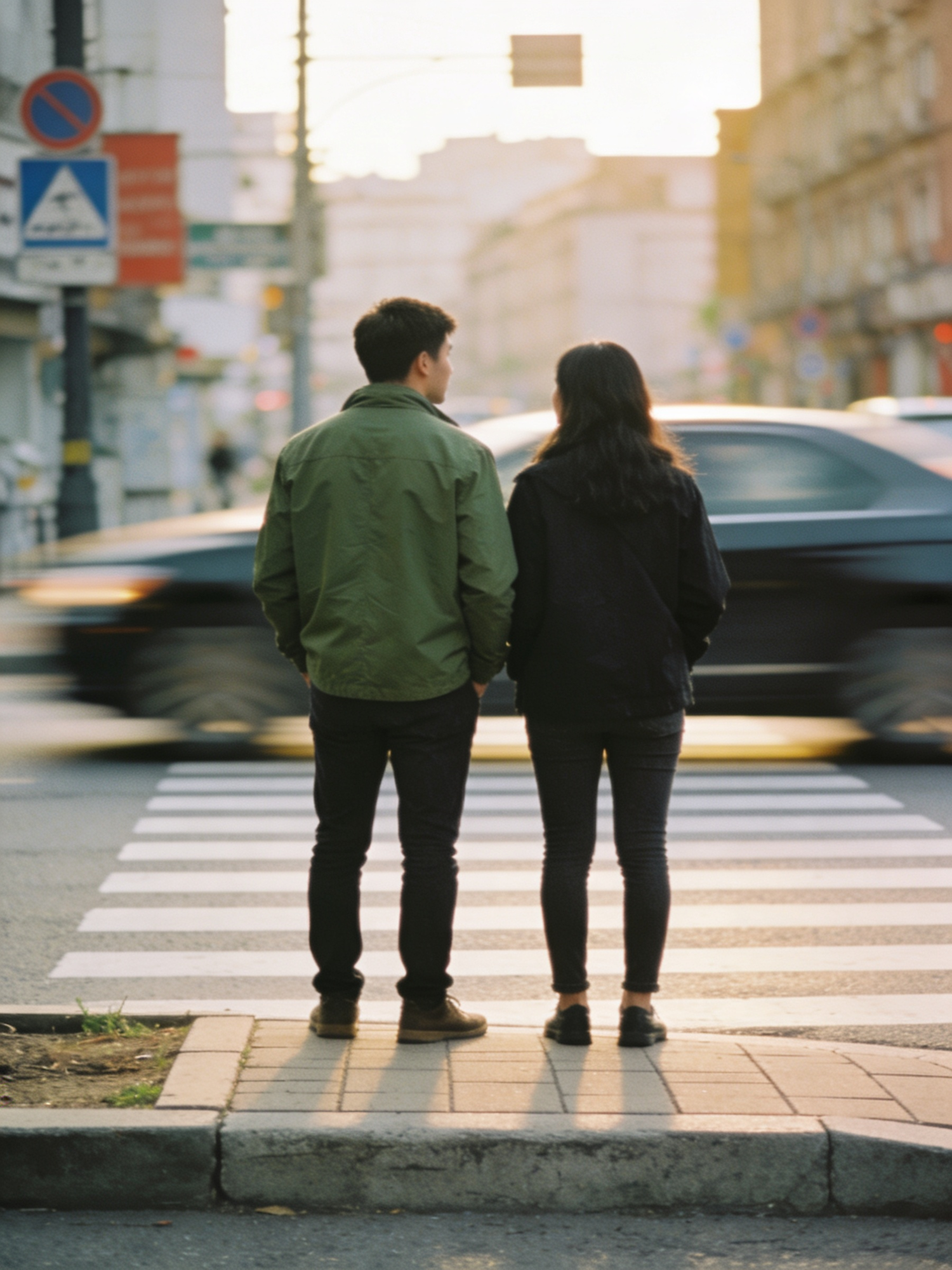 Ultra-documentary street photography, warm daylight, candid realism, gentle film grain, 35mm lens look. A couple waiting at a pedestrian crossing, one wearing a muted green jacket that anchors the scene, relaxed posture, traffic softly blurred.