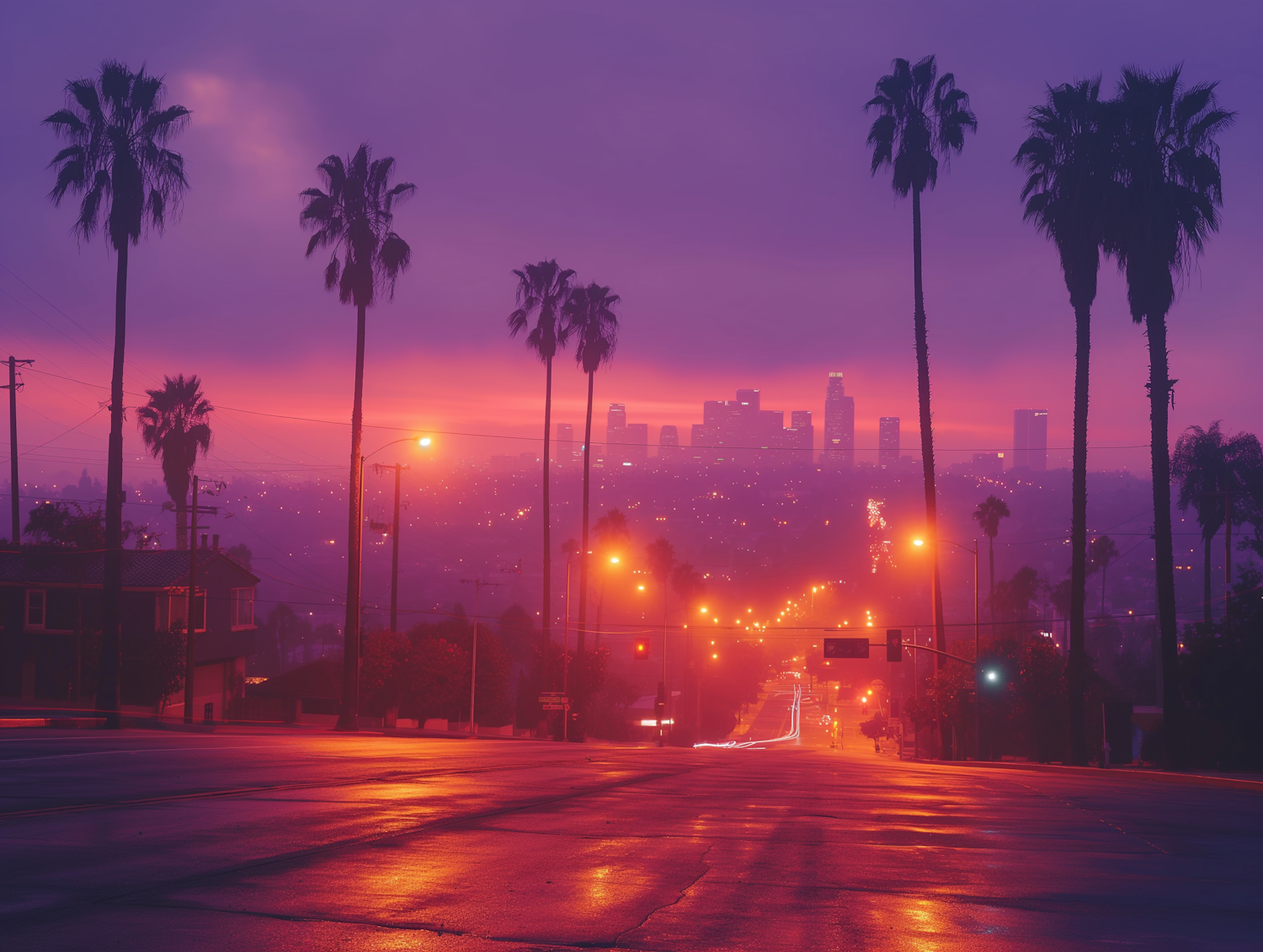 Vibrant cityscape at dusk with palm trees, colorful sky, and glowing streetlights reflecting on wet pavement.