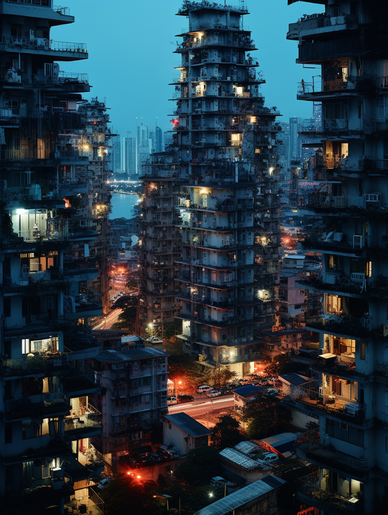 Densely packed urban buildings at dusk with warm lights, a river, and distant skyscrapers, creating a vibrant cityscape.