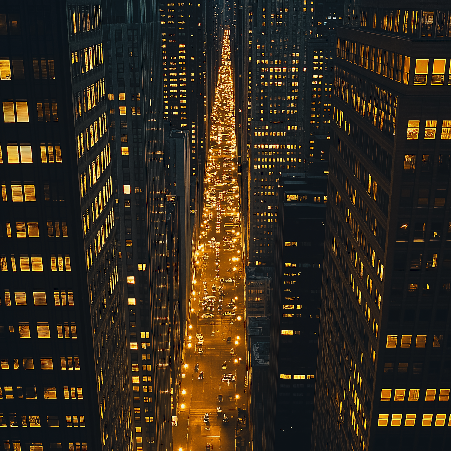 Aerial view of a glowing city street at night, framed by skyscrapers with warm lights and bustling traffic forming a golden river.