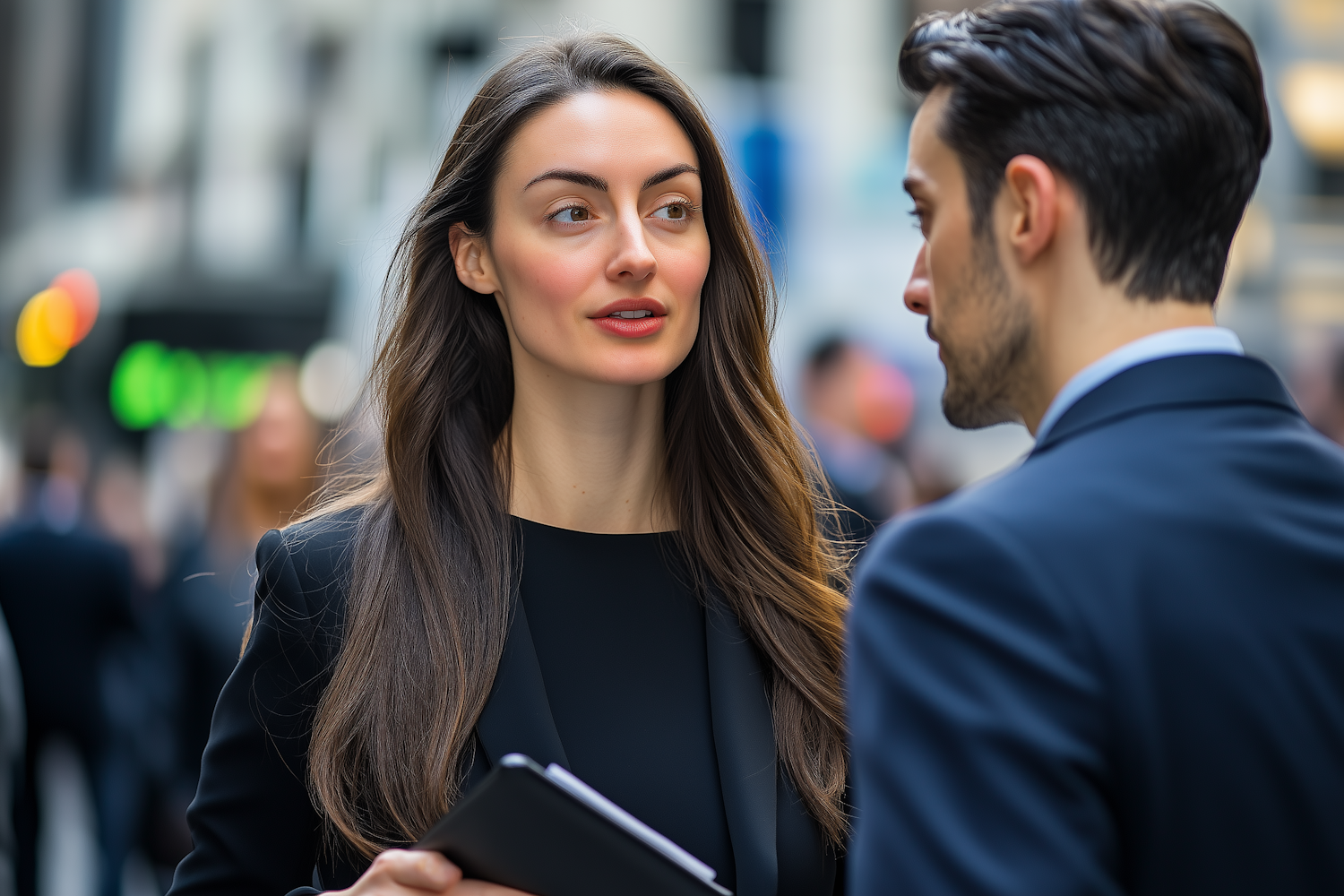 Professional woman in conversation with a man in a suit, holding a notebook in a busy urban setting.