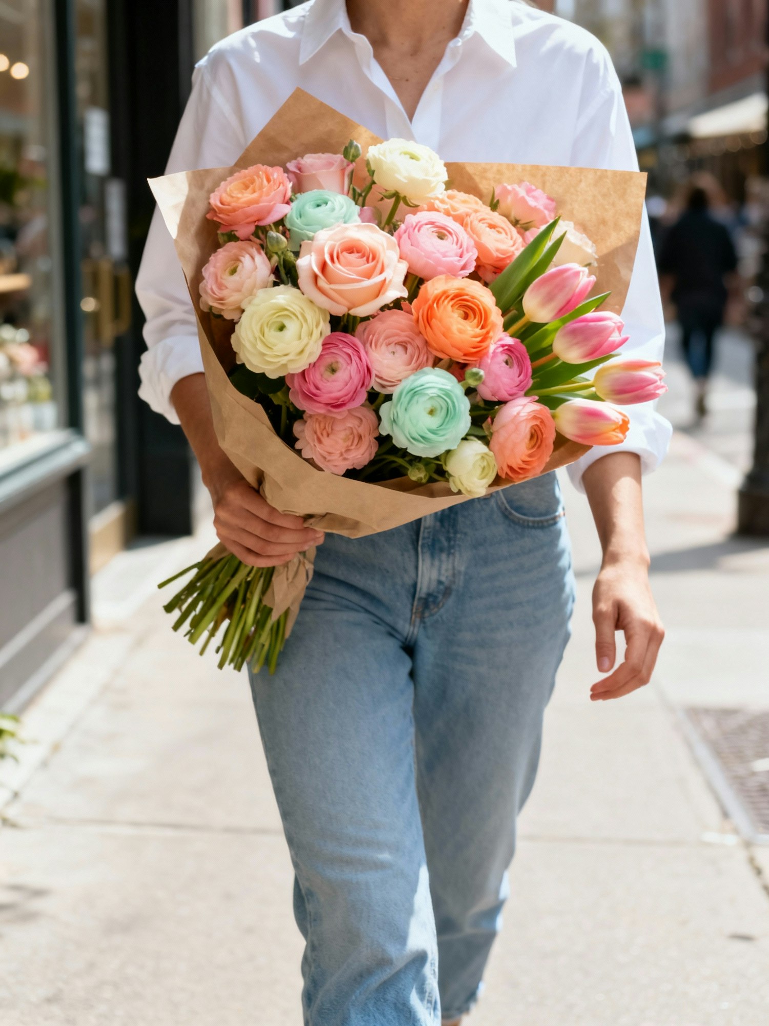 Vibrant bold aesthetic photograph, natural lifestyle style, soft daylight, candid framing, rich textures, colorful flower bouquet, not staged, influencer style photography, high quality realistic details — A person in light blue jeans and a crisp white shirt holding a bouquet wrapped in kraft paper, bouquet filled with pastel roses, ranunculus and tulips in shades of blush pink, peach and mint cream, candid city street background, natural lifestyle aesthetic