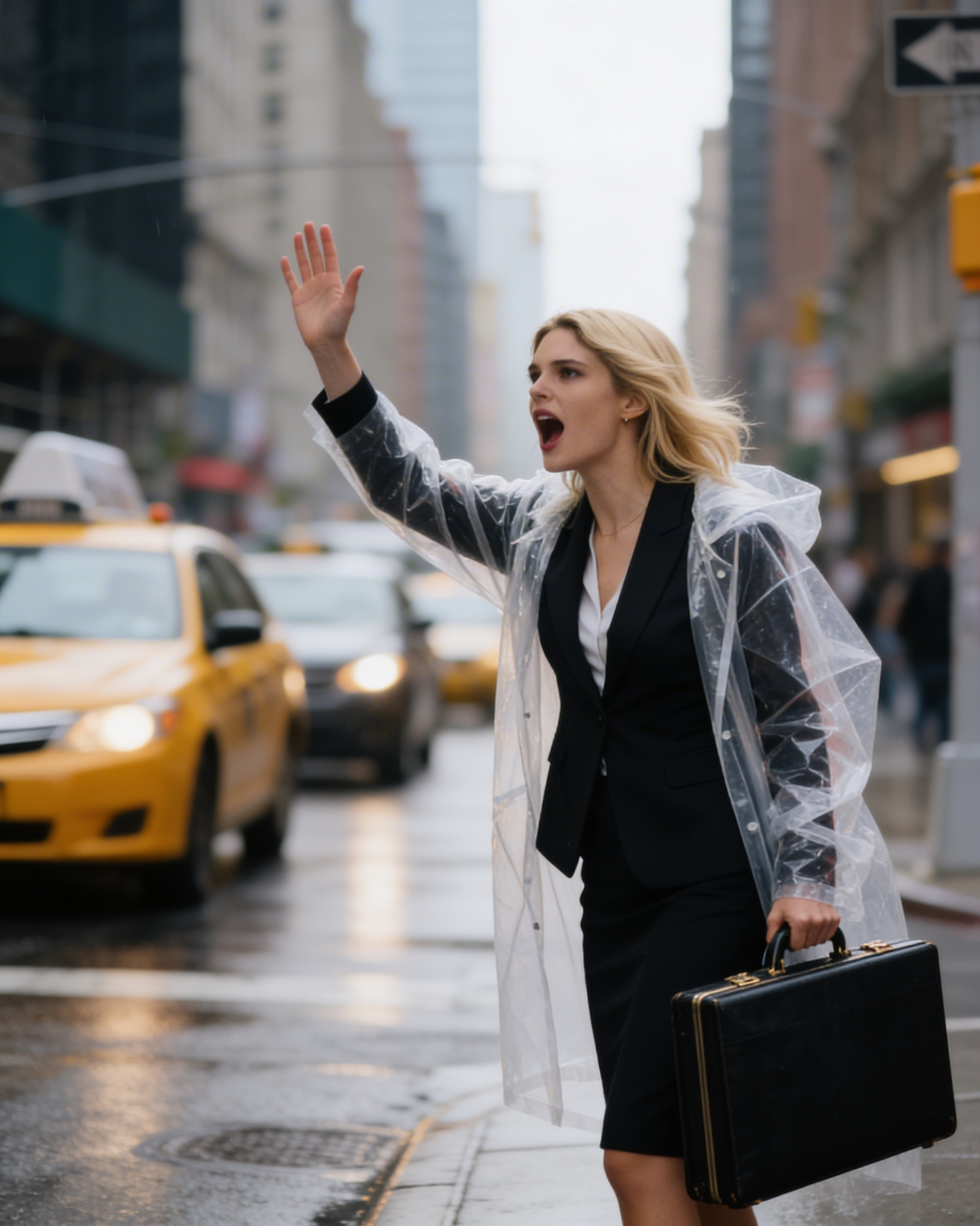 A professional woman hailing a taxi on a rainy city street, wearing a black suit and transparent raincoat, holding a briefcase.